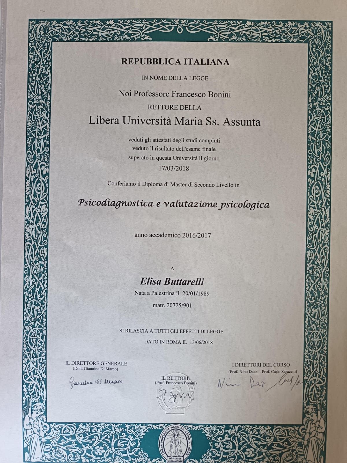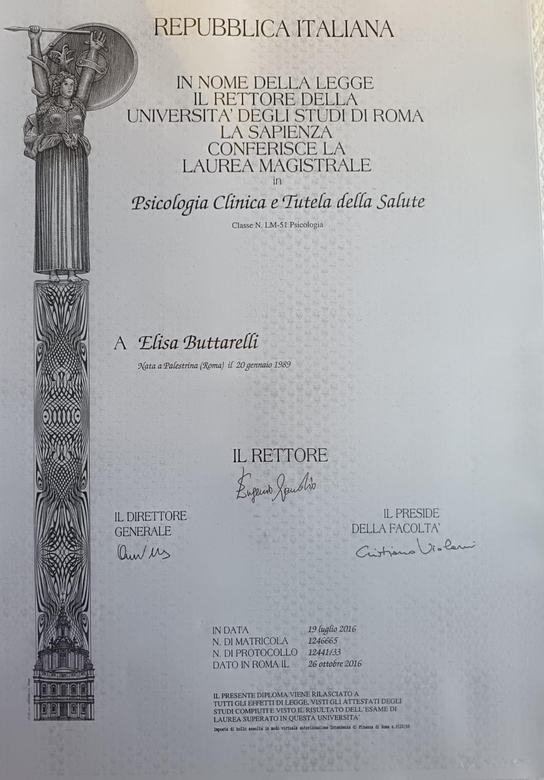 Sono la Dott.ssa Elisa Buttarelli, psicologa e psicoterapeuta sistemica relazionale in formazione. Da quasi vent’anni la Psicologia è molto più che il mio lavoro: è la mia passione, la mia missione, il mio modo di abitare il mondo.
