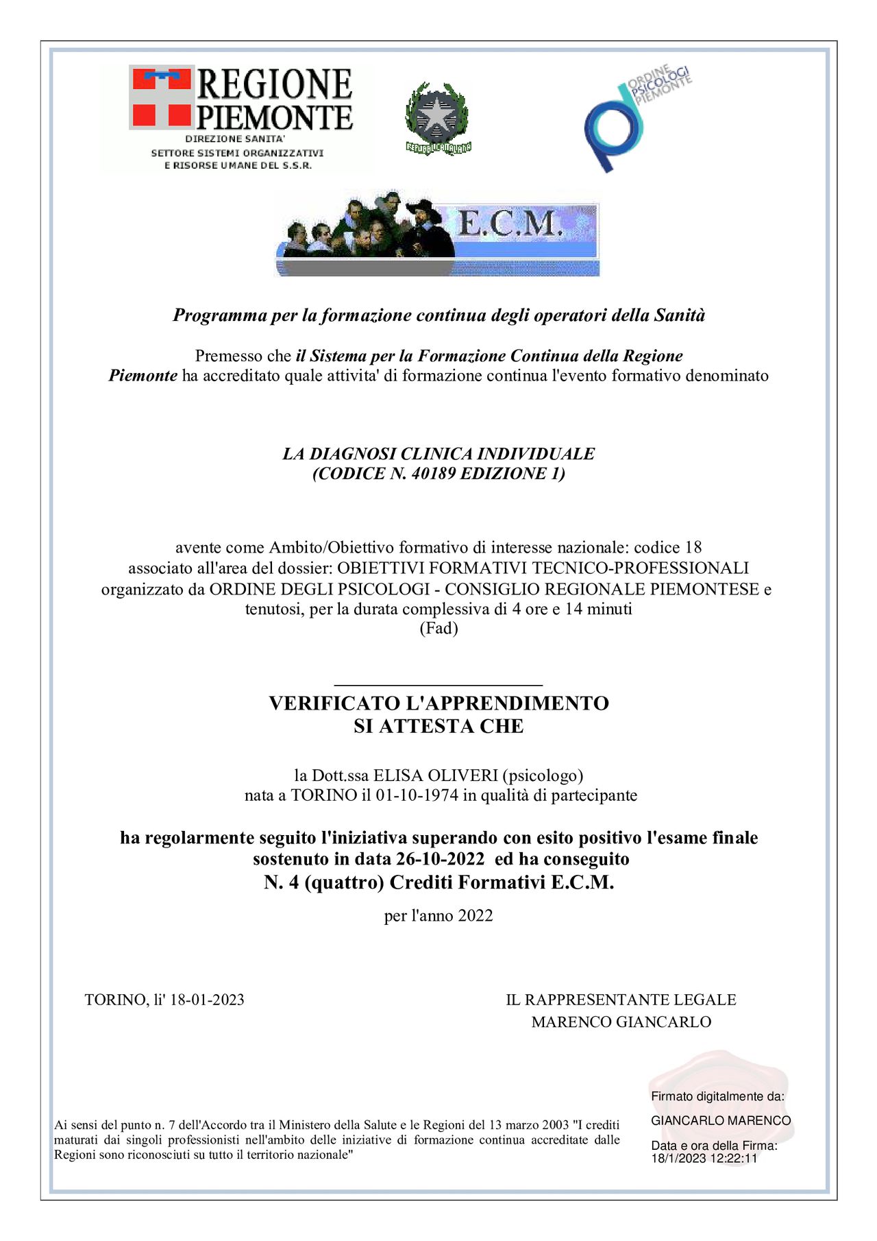 Sono iscritta all'Albo degli Psicologi del Piemonte al n° 8631.Ho svolto la specializzazione per 4 anni presso l'ASL TO3 di Orbassano nel Servizio Minori dove mi sono occupata di valutazioni DSA, ADHD, psicoterapia e sostegno alla genitorialità.