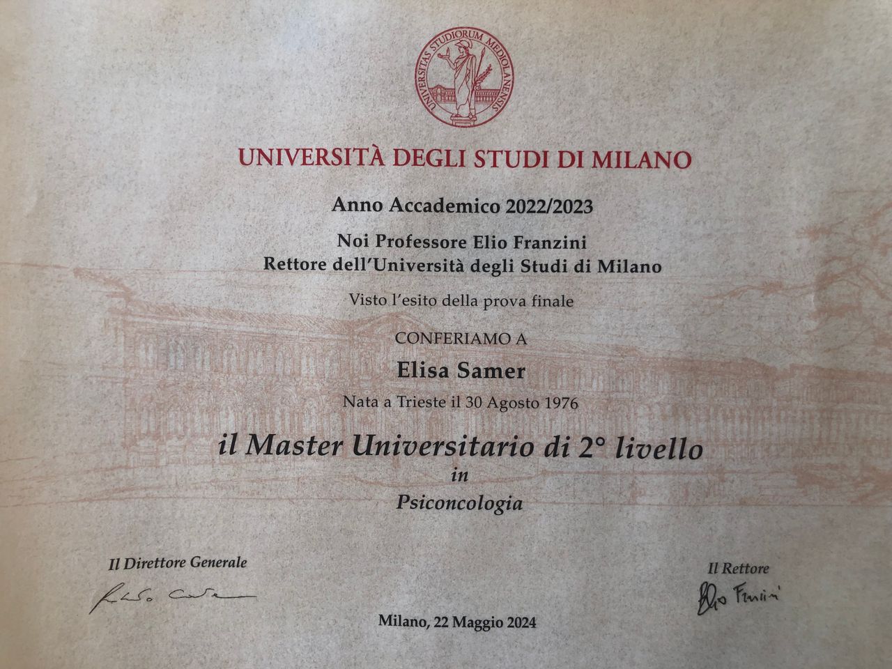 Sono iscritta regolarmente alla Società Italiana di Psiconcologia (SIPO) e collaboro con la clinica virtuale In buona salute, diretta dalla Prof.ssa Gabriella Pravettoni, una tra le massime esperte internazionali di psiconcologia e responsabile del master specialistico che ho frequentato.