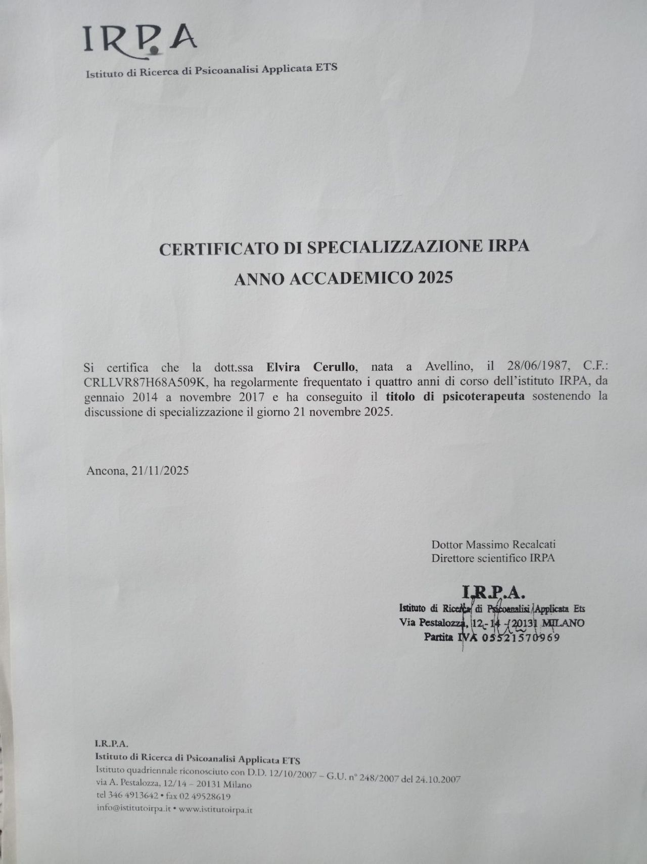 La Dottoressa Elvira Cerullo è stata un vero punto di riferimento per me. Con grande empatia e professionalità mi ha aiutato a comprendere le mie emozioni e a trovare modi concreti per affrontare le difficoltà quotidiane. Grazie a lei mi sento più leggera, sicura e capace di affrontare la vita con più serenità. Consiglio con tutto il cuore il suo supporto a chiunque voglia prendersi cura del proprio benessere emotivo.
