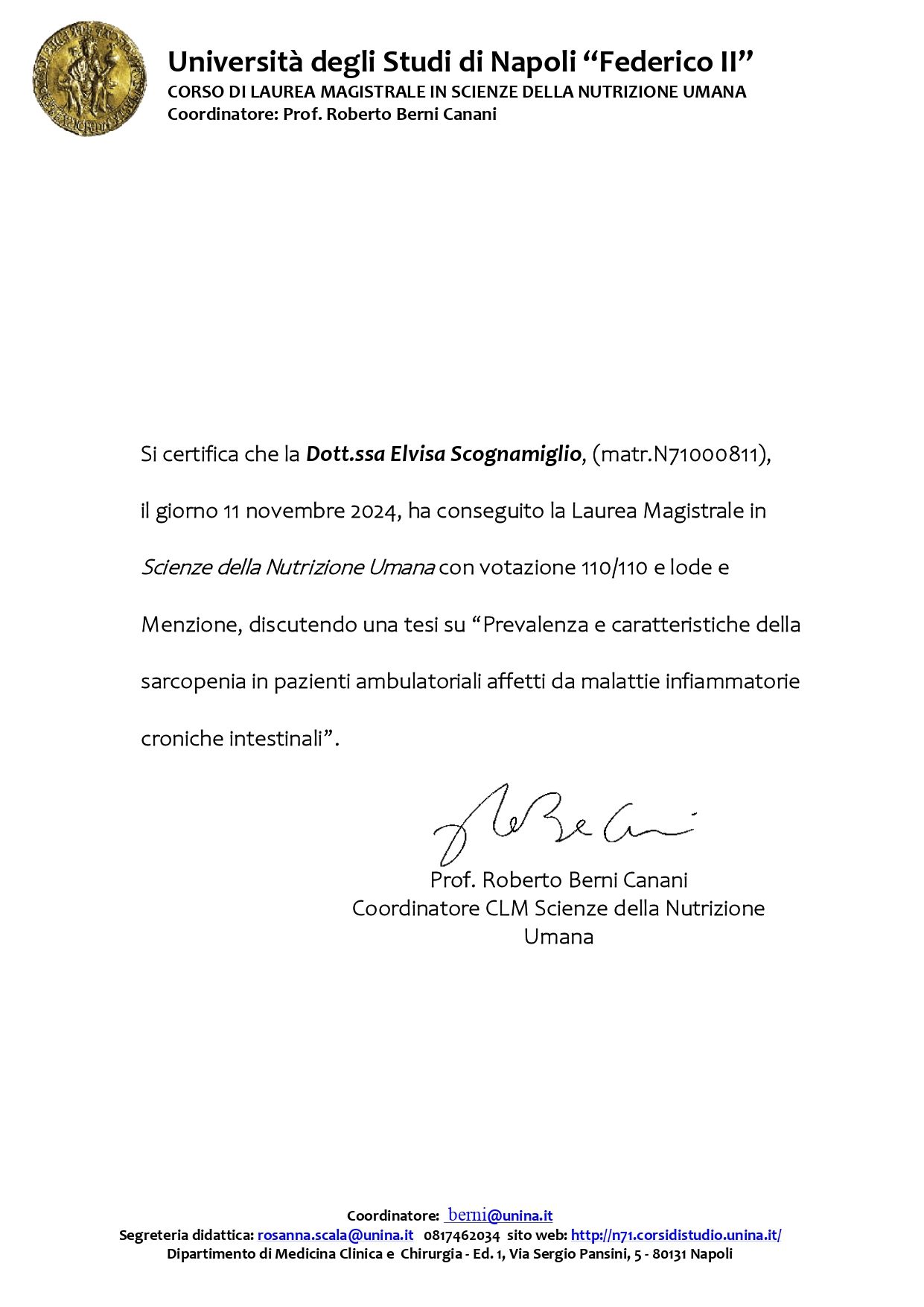 Mi sono laureata con il massimo dei voti e menzione alla carriera in Scienze della Nutrizione Umana presso l’Università degli Studi di Napoli “Federico II”. Ho maturato esperienza sia in ambito ospedaliero che nella ricerca scientifica, presso il Policlinico di Napoli Federico II, dove mi sono occupata della valutazione nutrizionale e della gestione di pazienti con malattie croniche infiammatorie intestinali, approfondendo temi come malnutrizione e sarcopenia.