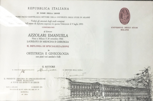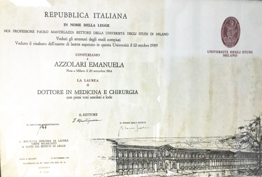 A Milano ho costruito ed ampliato le mie conoscenze conseguendo il 12/10/1989 la laurea in Medicina e Chirurgia presso l’Università statale e, dopo aver ottenuto l’abilitazione ad esercitare in qualità di Medico Chirurgo, ho continuato i miei studi conseguendo la specializzazione in ostetricia e Ginecologia il 09/07/1993.