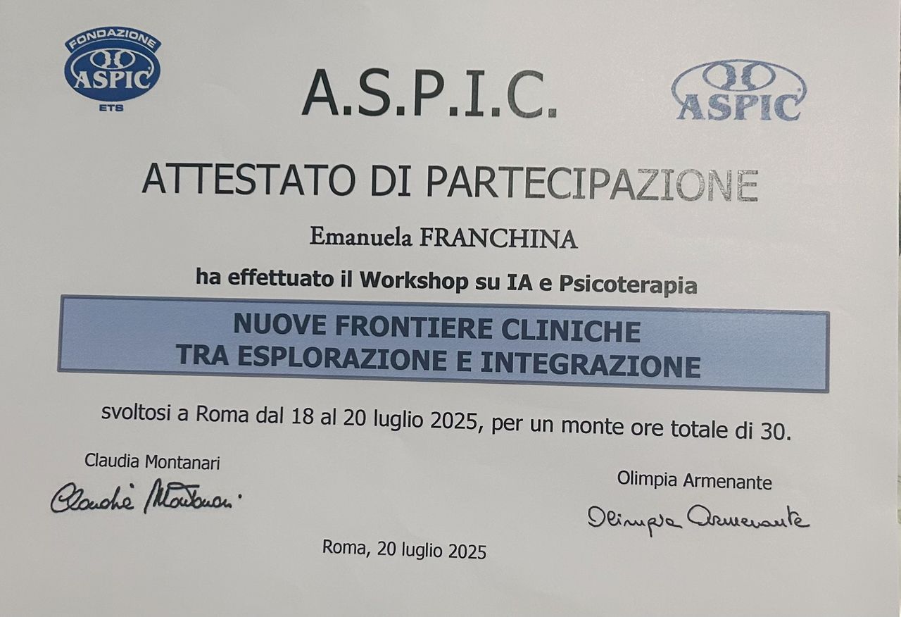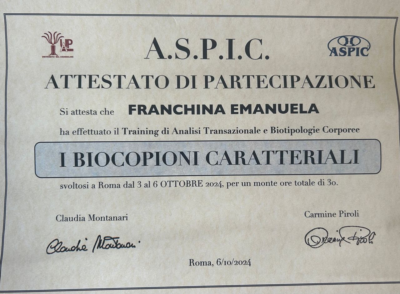 Mi chiamo Emanuela Franchina e sono una psicologa, attualmente in formazione come psicoterapeuta presso la Scuola di Specializzazione ASPIC di Roma, dove seguo un approccio integrato e centrato sulla persona.