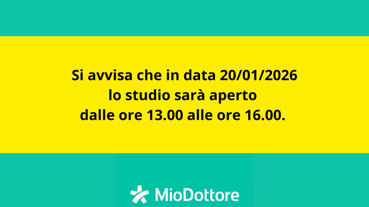 Esclusivamente per EFFETTIVE URGENZE MEDICHE la pediatra è disponibile al numero 3514406544 dal lunedì al venerdì dalle 9 alle 13 e dalle 15 alle 18. Al di fuori di tali orari QUESTO NUMERO E' SPENTO, pertanto le richieste inviate non possono essere ricevute nè evase. In caso di necessità inviarle di nuovo negli orari indicati, per URGENZE INDIFFERIBILI rivolgersi al Servizio di Continuità Assistenziale o al Pronto Soccorso.