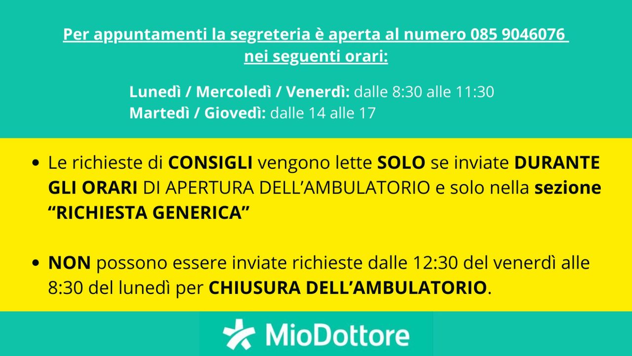 Per ogni altra necessità (CONSIGLI, CERTIFICATI, PRESCRIZIONI, INVIO REFERTI): inviare un messaggio nella sezione dedicata dell'App MioDottore (disponibile gratuitamente nello store del vostro smartphone) specificando il nome del bambino/bambina (NON DEL GENITORE).