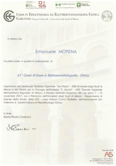 Oltre alla specilizzazione in neurologia, nel 2024 ho conseguito il titolo di "dottore di ricerca" nel corso Plasticità Neurosensoriale presso il dipartimento NESMOS dell'Università di Roma "Sapienza", sede Sant'Andrea.