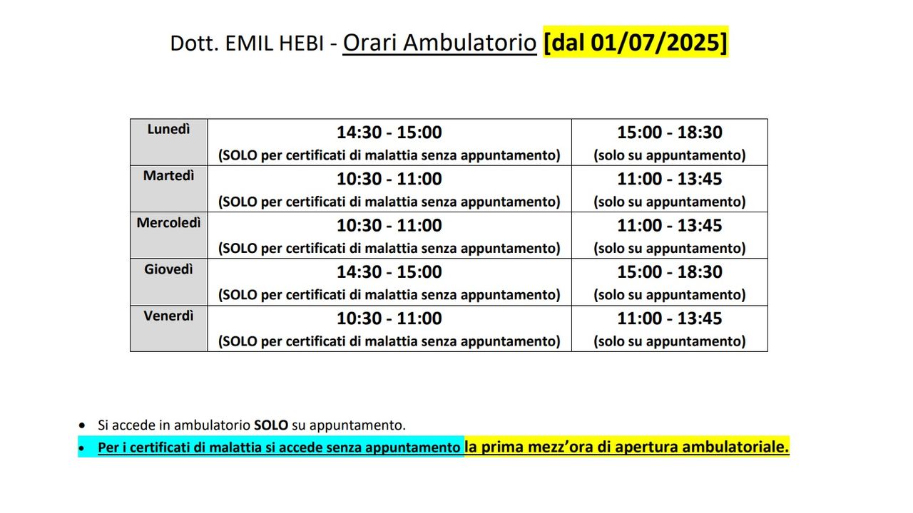 Lunedì 14:30 - 15:00 (SOLO per certificati di malattia senza appuntamento)