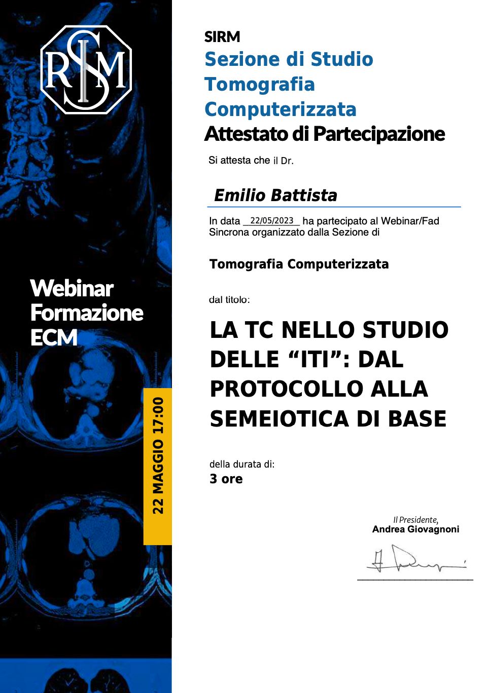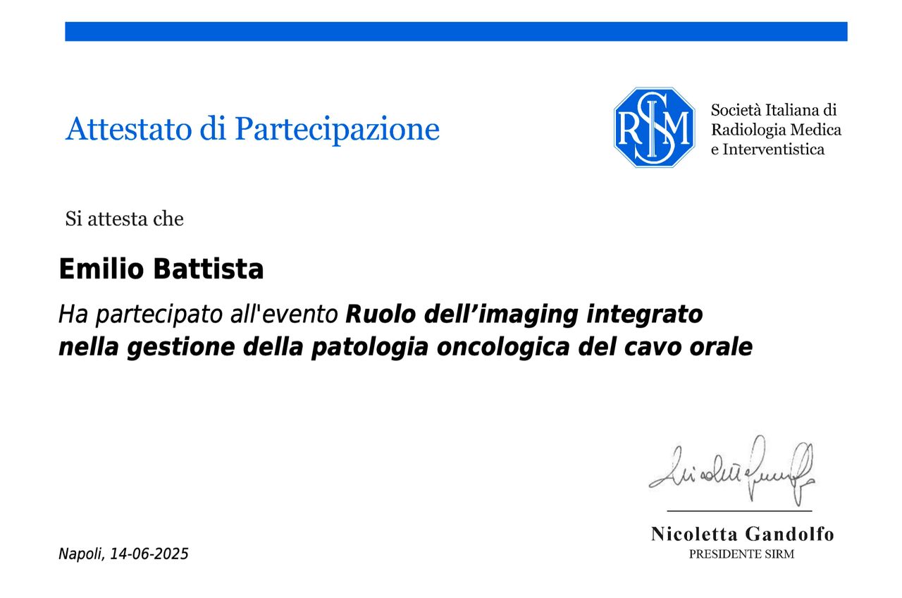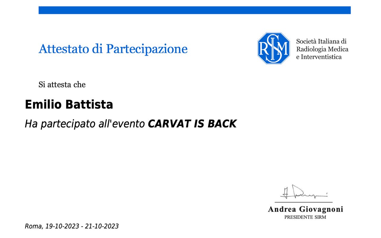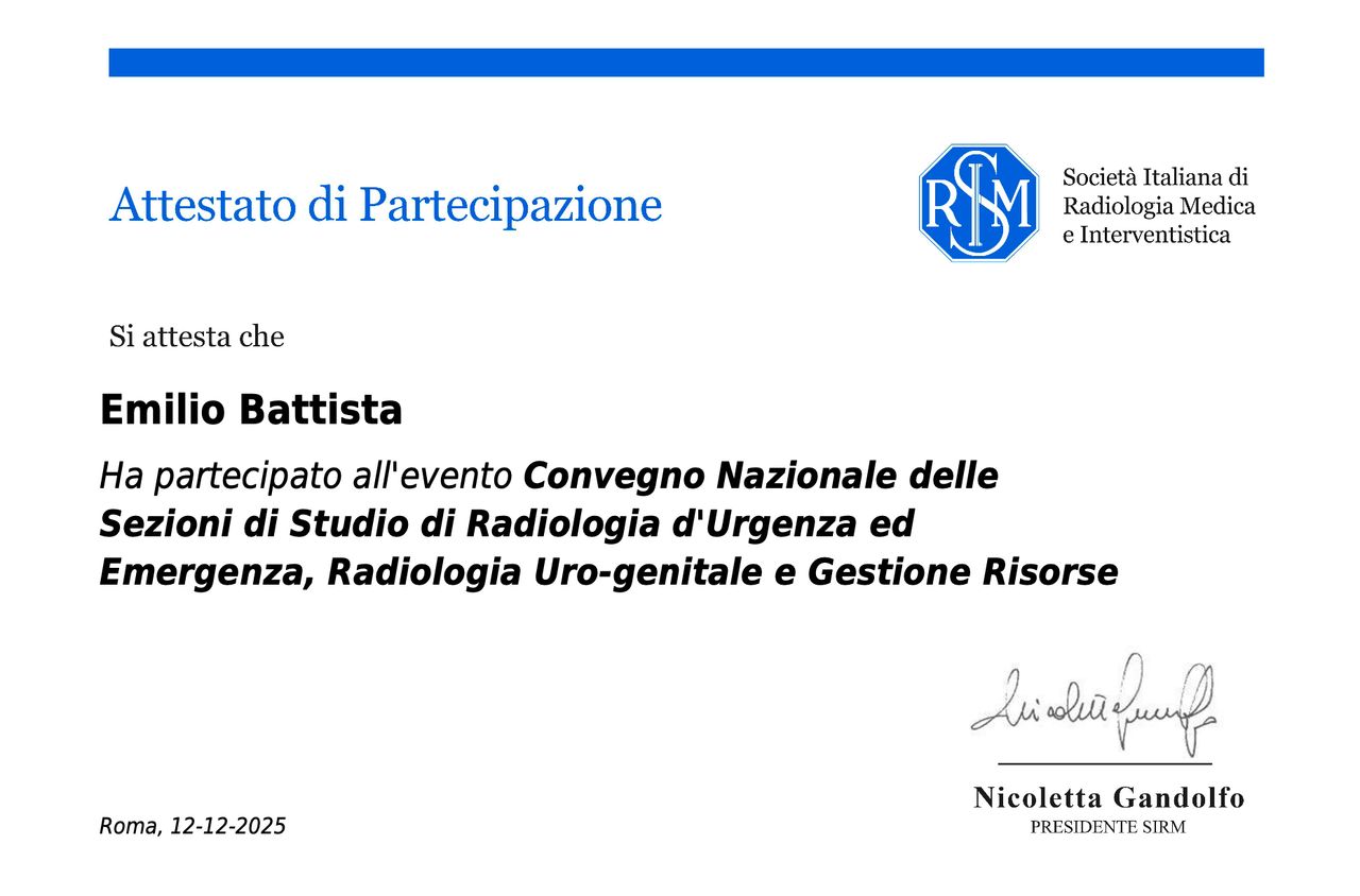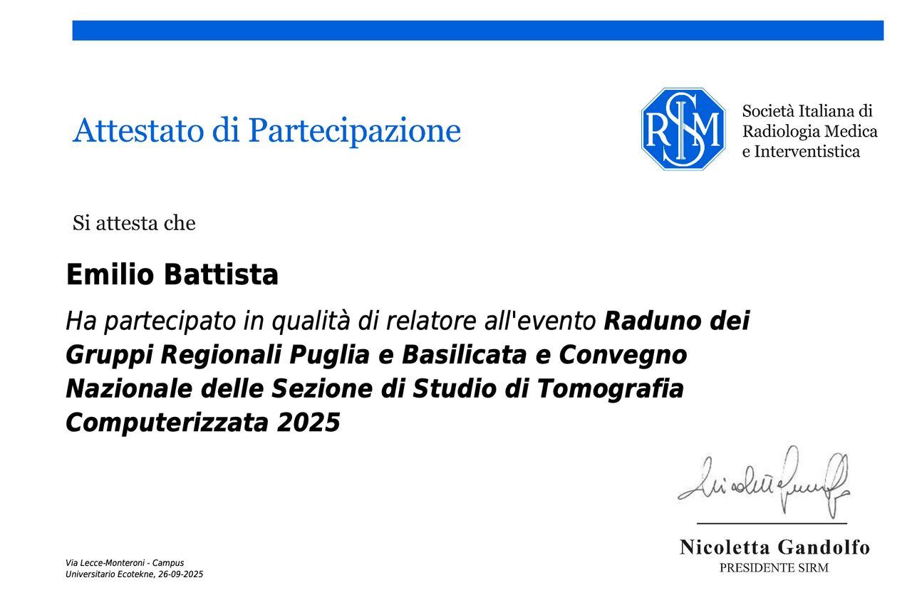Autore di 20+ comunicazioni orali, ePoster, relazioni a Congressi e Corsi Istituzionali SIRM/ESR