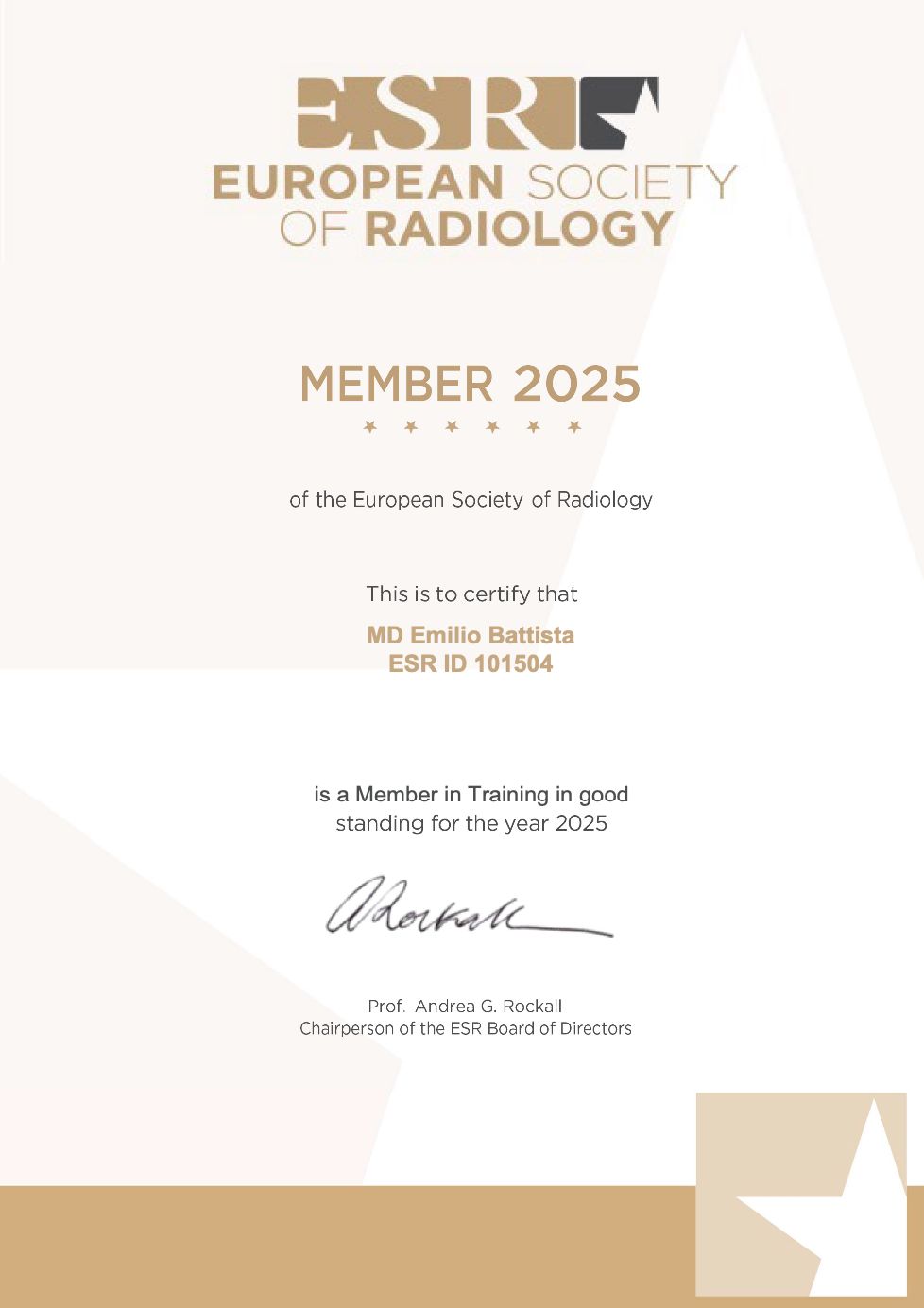 Full Member della European Society of Radiology (ESR), Socio per la Ricerca della Società Italiana di Radiologia Medica e Interventistica (SIRM), Full member della European Society of Cardiovascular Radiology (ESCR).