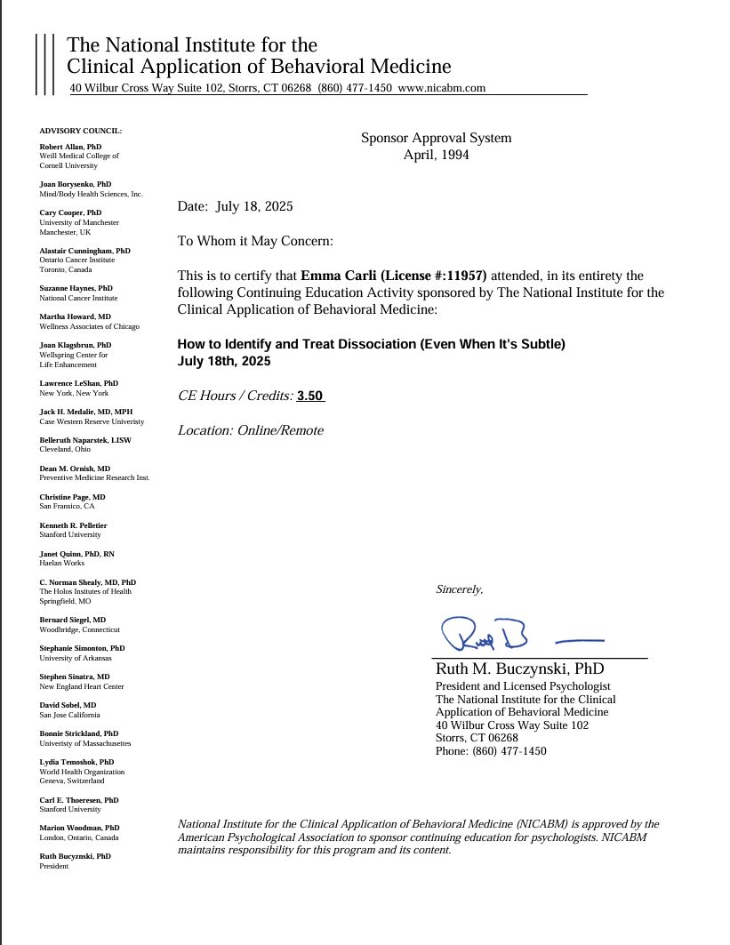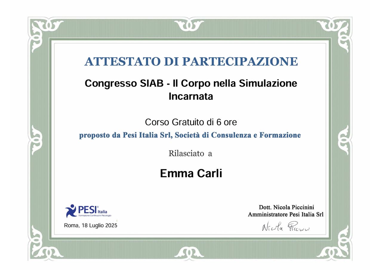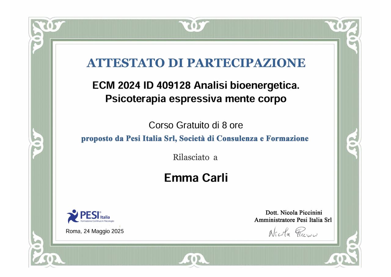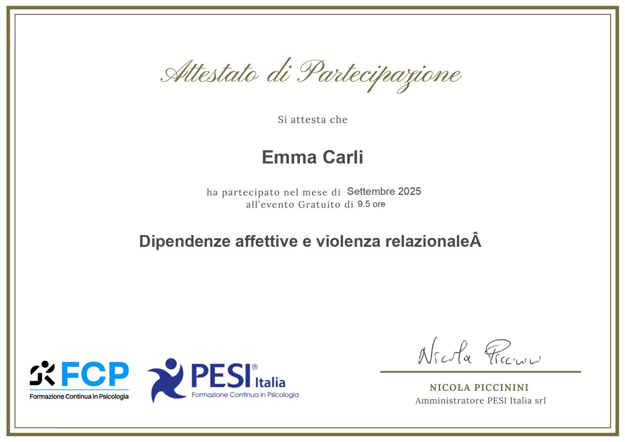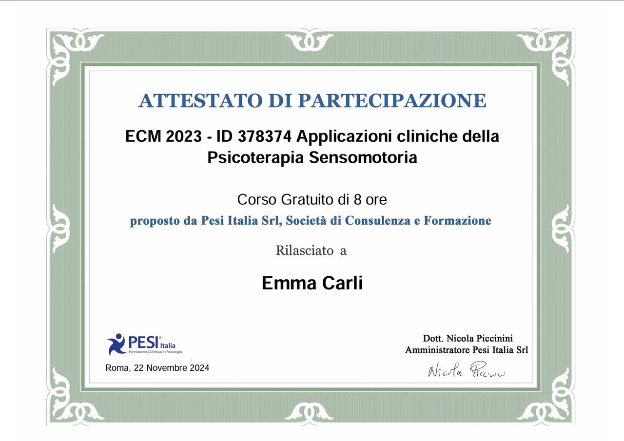 Emma Carli è una spalla su cui fare affidamento oltre che una grande professionista. Ho apprezzato la sua sincerità e il suo altruismo. È empatica, piena di energia e preparatissima. Tratta le mie problematiche con una scientificità e preparazione di alto livello.
