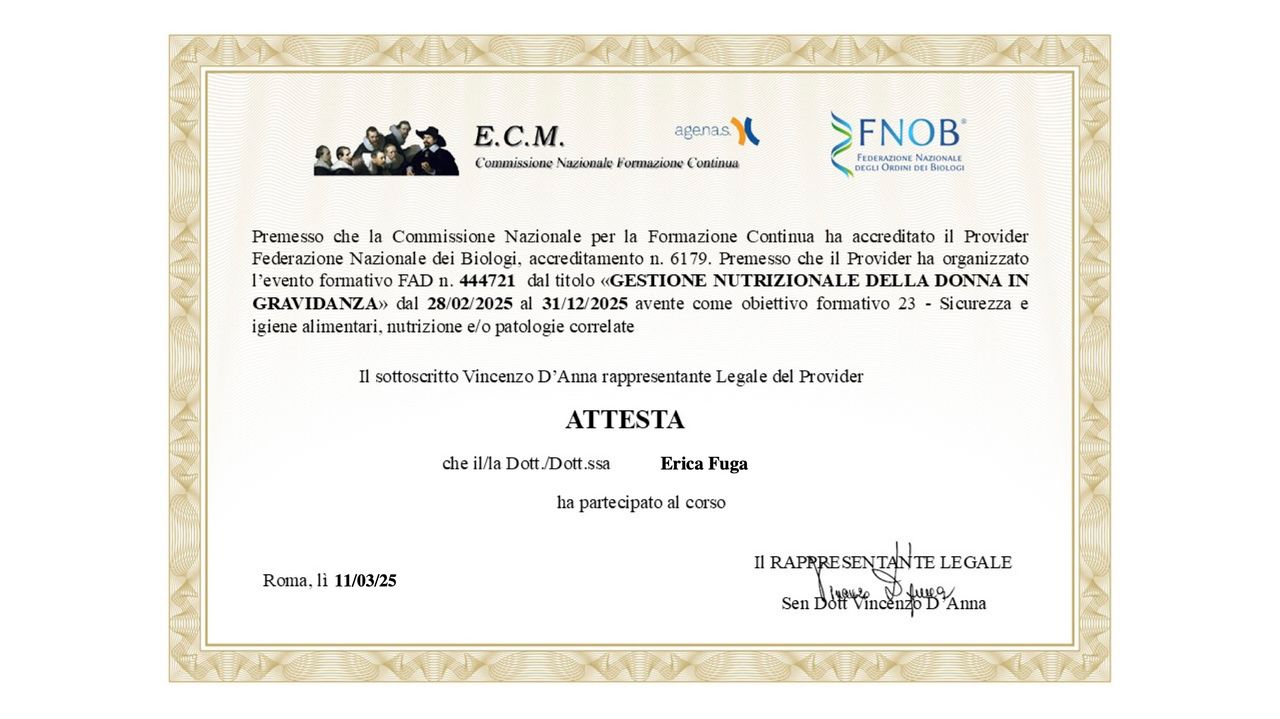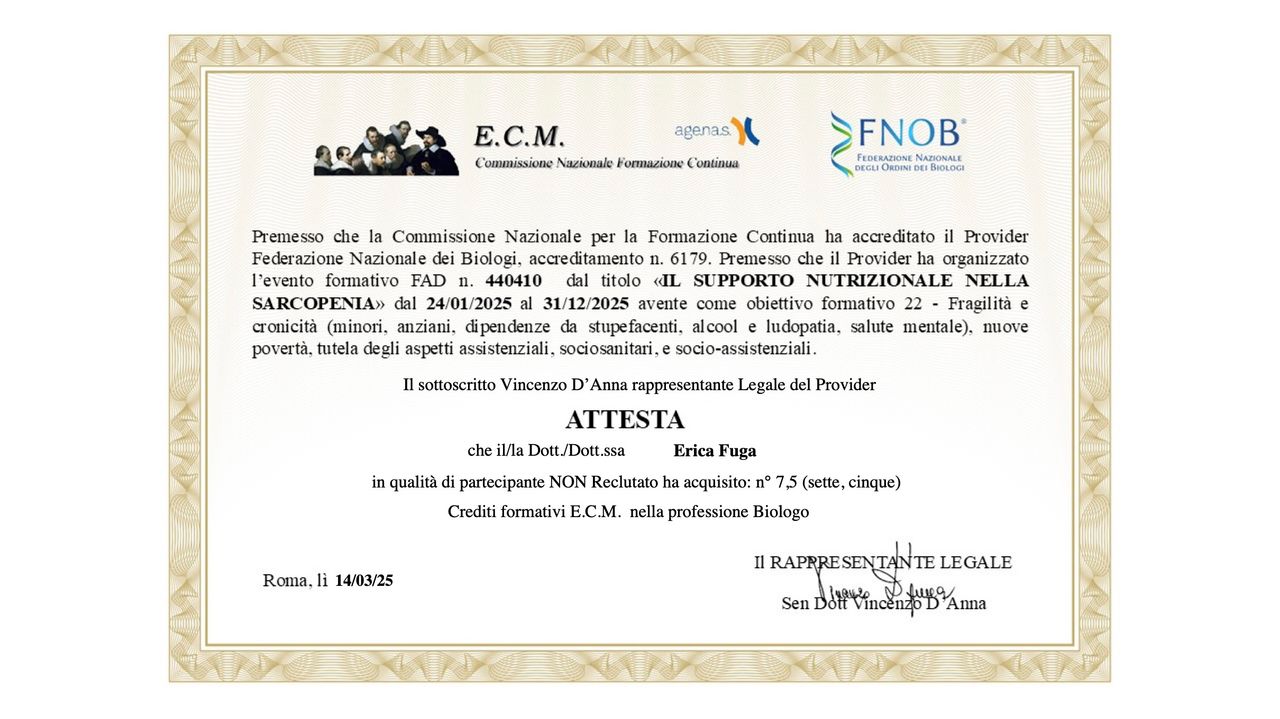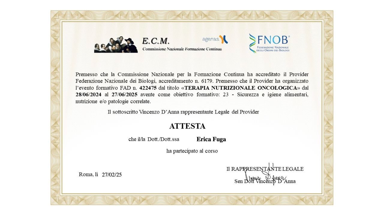 Competenza, chiarezza ed empatia sono caratteristiche che identificano la Dott.ssa Erica. La scelta migliore per un cambiamento duraturo e consapevole. Affidarmi alla Dott.ssa Erica è stata una delle decisioni più importanti per la mia salute e il mio benessere generale. La sua professionalità è impeccabile: ogni consiglio, il piano alimentare è basato su solide basi scientifiche e non su mode passeggere. Ciò che la distingue è la sua capacità di vedere la persona nella sua interezza. Ho trovato un ambiente di ascolto e supporto. La Dott.ssa Erica mi ha insegnato non solo cosa mangiare, ma anche il perché, dandomi gli strumenti per mantenere i risultati nel tempo e gestire ogni situazione alimentare (viaggi, cene fuori, ecc.). Consigliatissima a chiunque cerchi un approccio serio, personalizzato e mirato a un miglioramento della qualità della vita a 360 gradi. Una vera esperta nel suo campo!