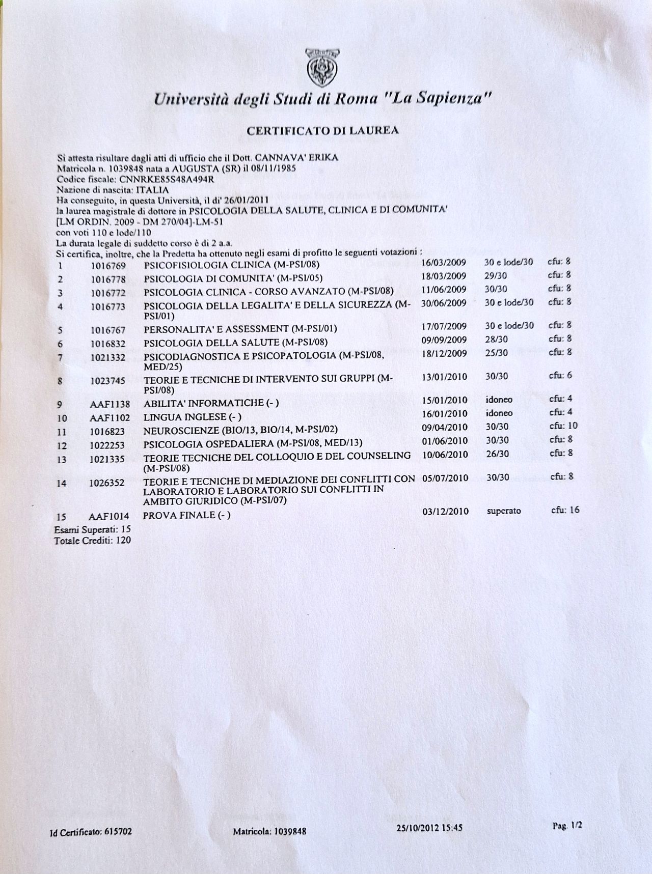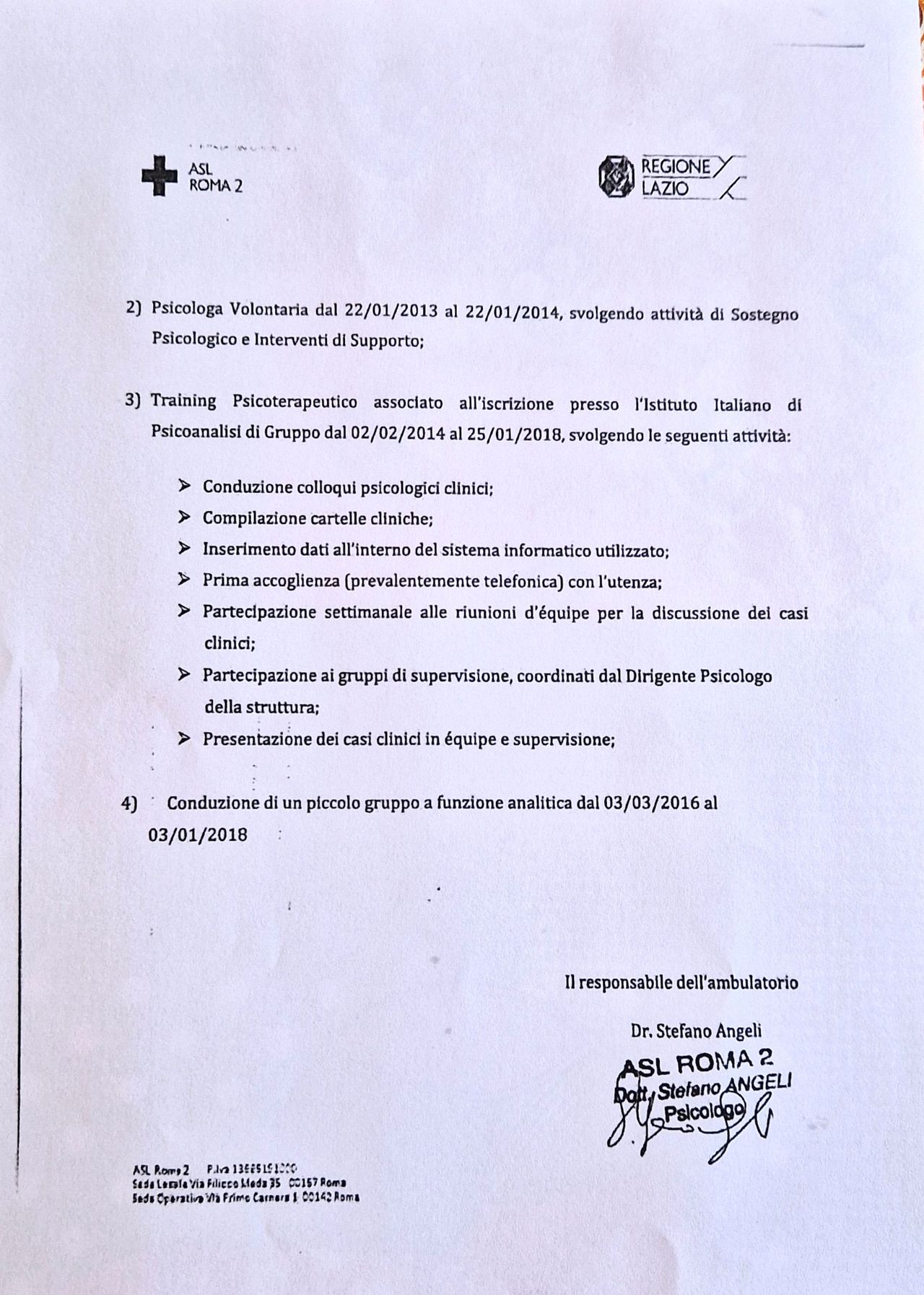 Psicologa, psicoterapeuta individuale e di gruppo, specializzata presso l'Istituto Italiano di Psicoanalisi Individuale e di Gruppo, sede di Roma.
