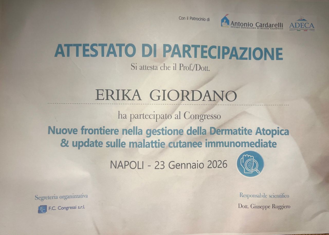 Sono la Dott.ssa Giordano Erika e mi occupo di Dermatologia e Venereologia. Svolgo attività clinica e chirurgica occupandomi della diagnosi e del trattamento delle principali patologie cutanee, con particolare attenzione alla prevenzione, alla salute della pelle e alla qualità di vita del paziente.