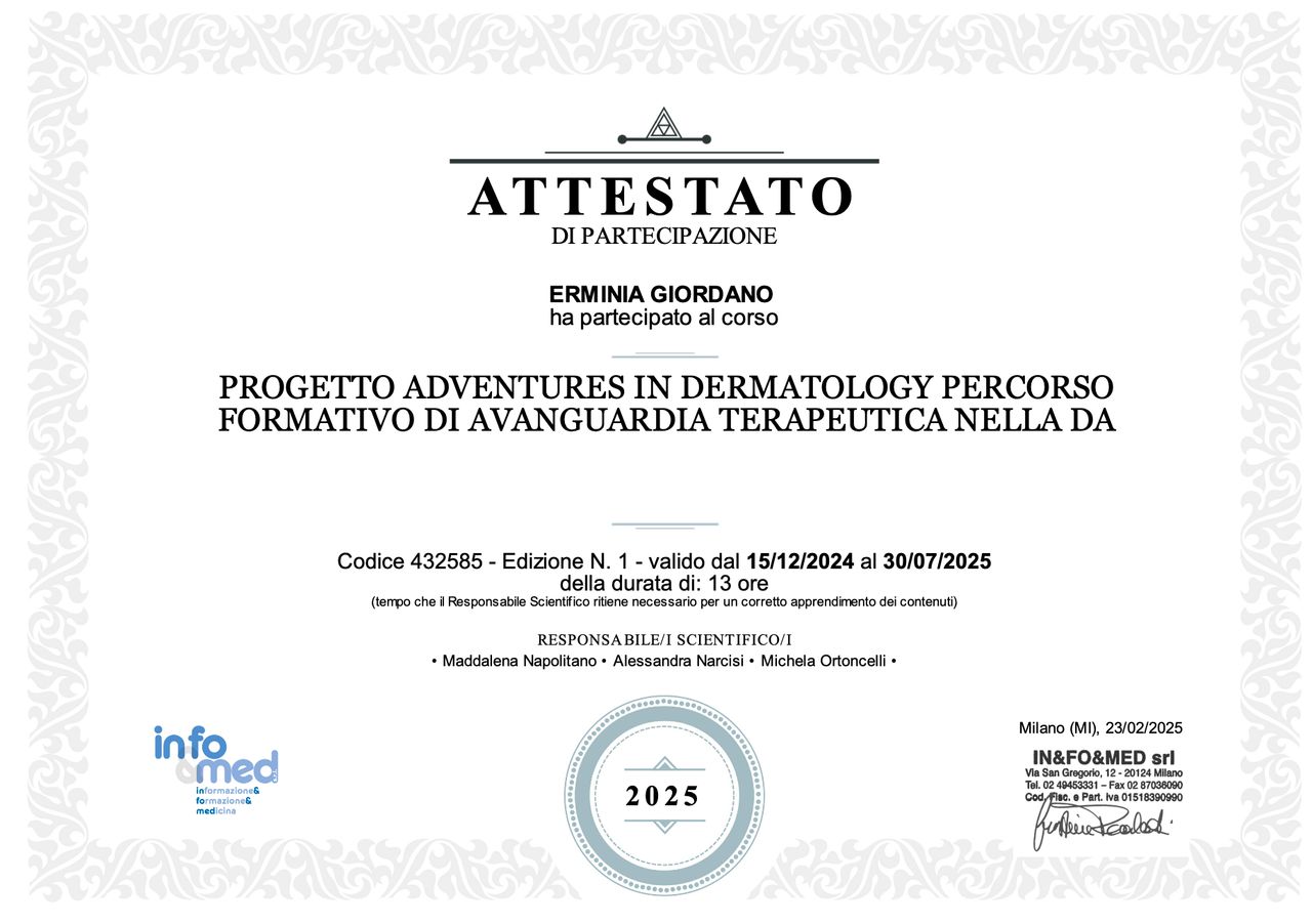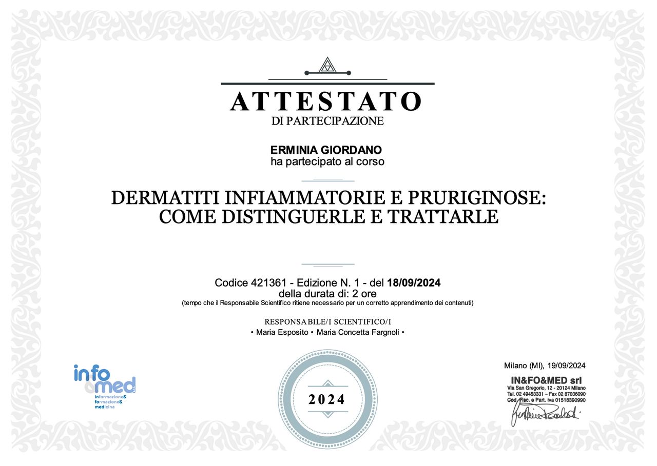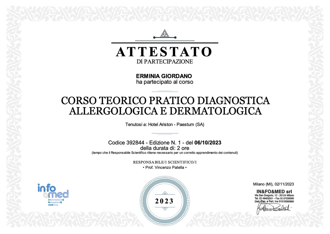 Salve a tutti, sono la Dott.ssa Erminia Giordano, medico specialista in Allergologia e Immunologia Clinica. Ho ampliato la mia formazione professionale conseguendo un Master di II livello in Malattie Infiammatorie Croniche Cutanee, e partecipando a numerosi congressi e corsi avanzati, tra cui corsi di perfezionamento sulla Spirometria e l'Allergologia Pediatrica.