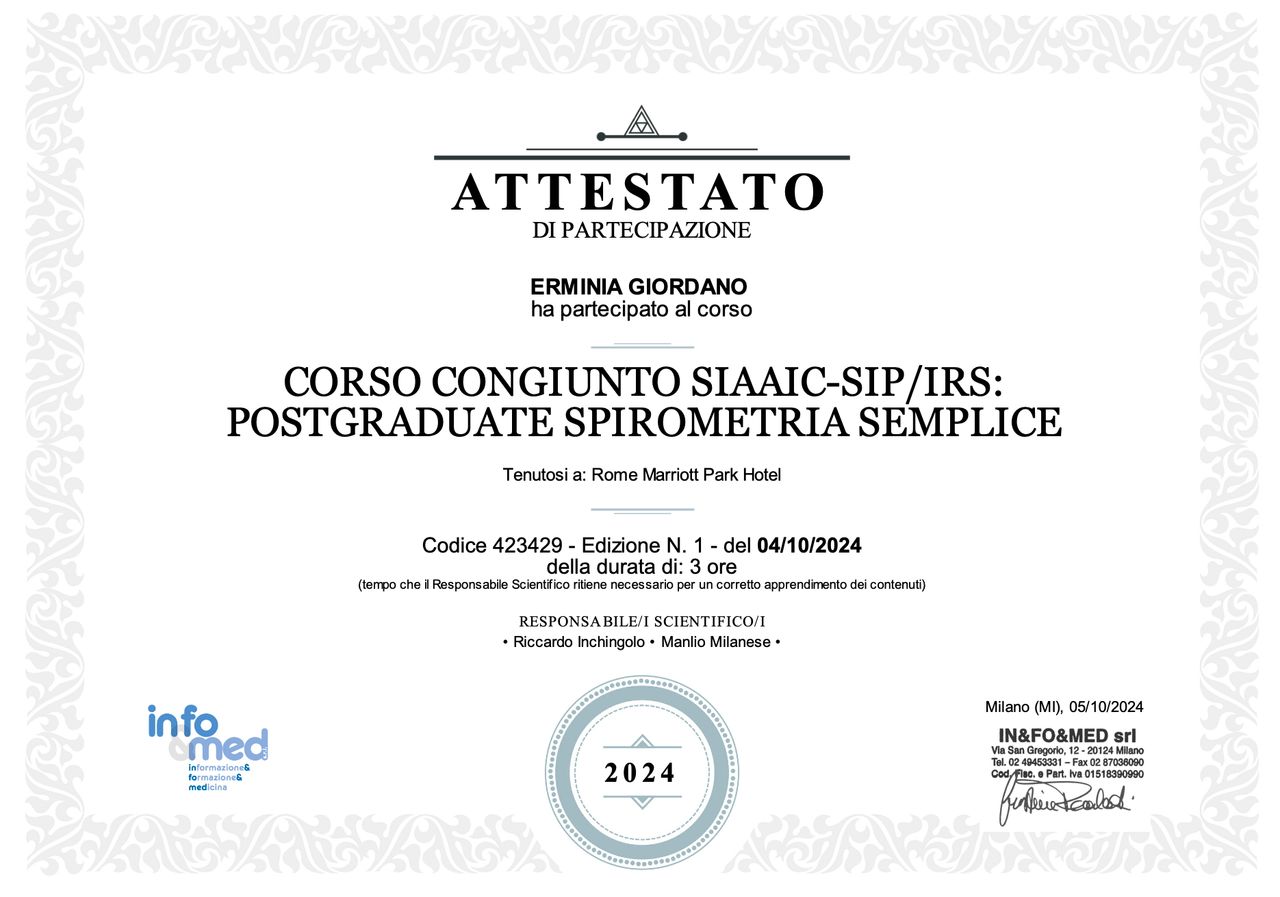 Ho inoltre effettuato un lungo periodo di formazione presso il centro di Allergologia dell'Ospedale S. Maria Della Speranza di Battipaglia, dove ho approfondito i temi dell'immunoterapia allergene specifica, l'allergia al veleno di imenotteri e le reazioni avverse ai farmaci.