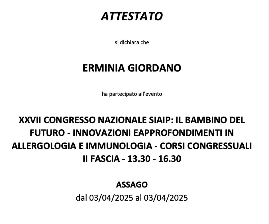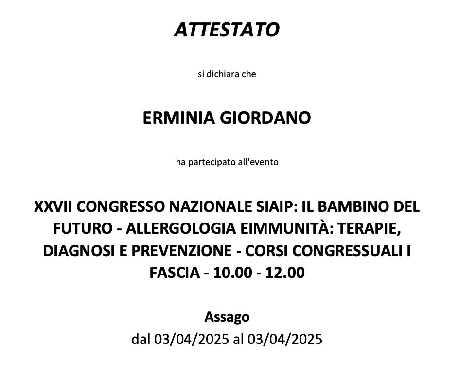 Ho infatti svolto la mia tesi di Specializzazione presso il centro di Allergologia Pediatrica dell'AOU Federico II dove mi sono occupata principalmente di dermatite atopica, ma anche di allergie alimentari e respiratorie nei pazienti pediatrici.