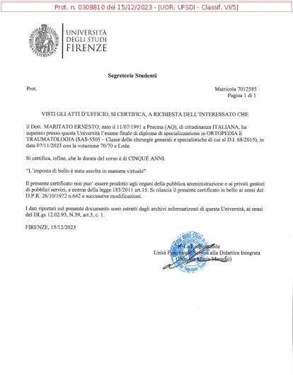 Durante la mia attività lavorativa, nel trattamento di una varietà di problemi ortopedici, mi interfaccio quotidianamente con pazienti di ogni fascia di età. Sono specializzato nel trattamento delle patologie della spalla, dell'anca e del ginocchio, con comprovata competenza nella chirurgia protesica e artroscopica.