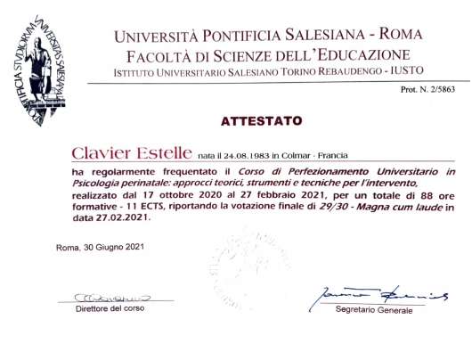 Je collabore également avec les Services Hospitaliers et de Psychologie Périnatale de l’A.S.L.TO5 de Chieri et Moncalieri.