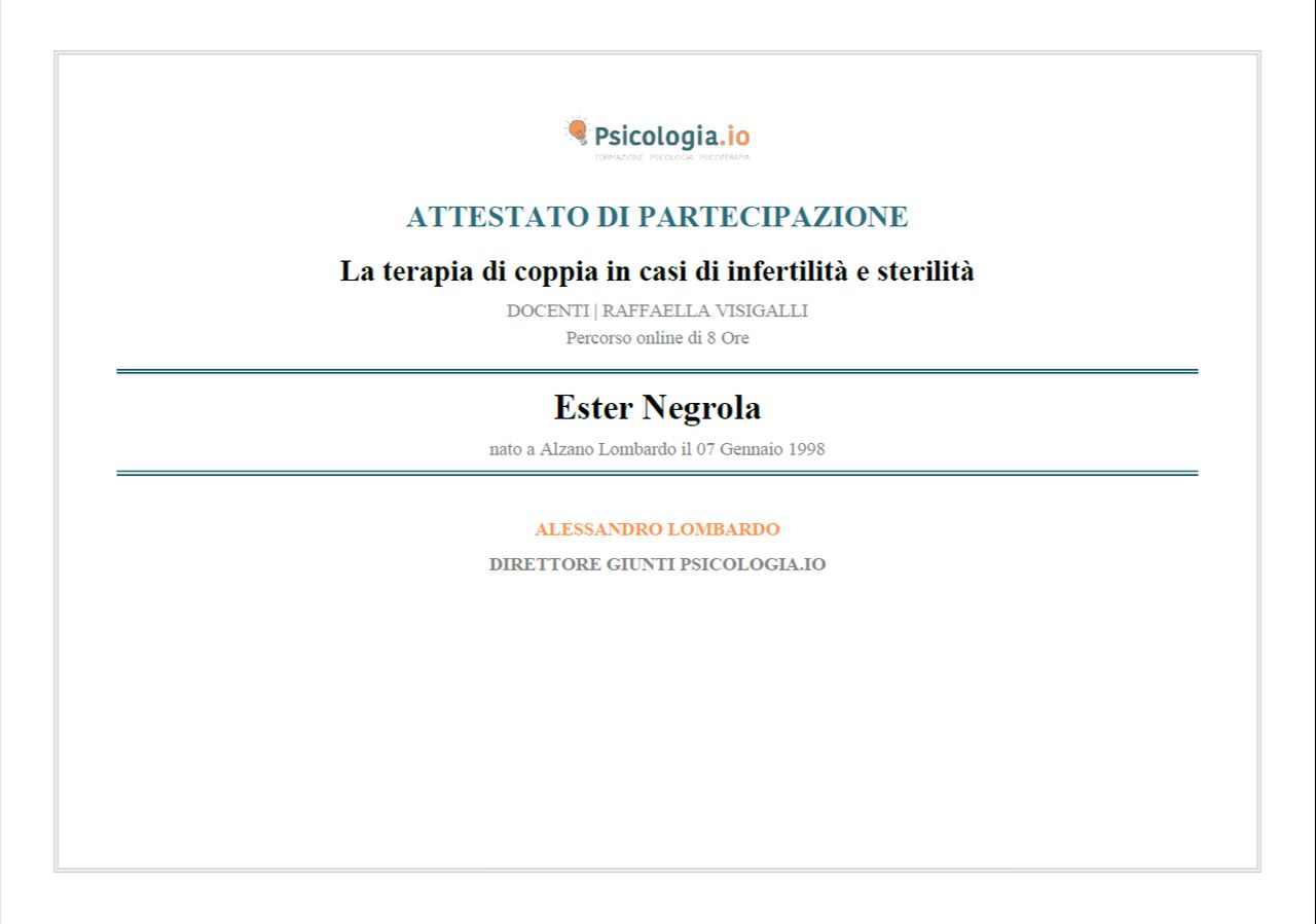La prima seduta con la Dottoressa Ester Negrola è stata davvero molto positiva! Mi ha colpito fin da subito la sua attenzione, e, soprattutto, la sua capacità di mettermi a mio agio. È riuscita a farmi vedere il problema da un punto di vista nuovo, con grande sensibilità e chiarezza. Dopo l’incontro mi sono sentita compresa e con una nuova consapevolezza. Continuerò sicuramente il percorso con lei!