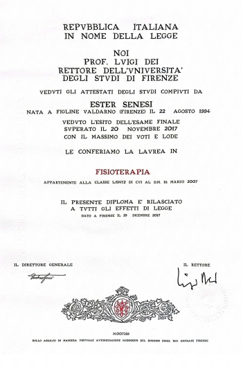 Laureata in Fisioterapia nel 2017 presso l’Università degli Studi di Firenze con 110 e lode. Ho cominciato a lavorare per la Casa di Cura Frate Sole, dove ancora oggi lavoro. Nel dicembre 2018 ho proseguito la formazione con un corso di Rieducazione Posturale Globale. Nel 2021 ho conseguito il Master in Riabilitazione dei Disordini Muscolo-scheletrici presso l’Università degli Studi di Genova. Nel 2022 ho ultimato la formazione in riabilitazione del pavimento pelvico.
