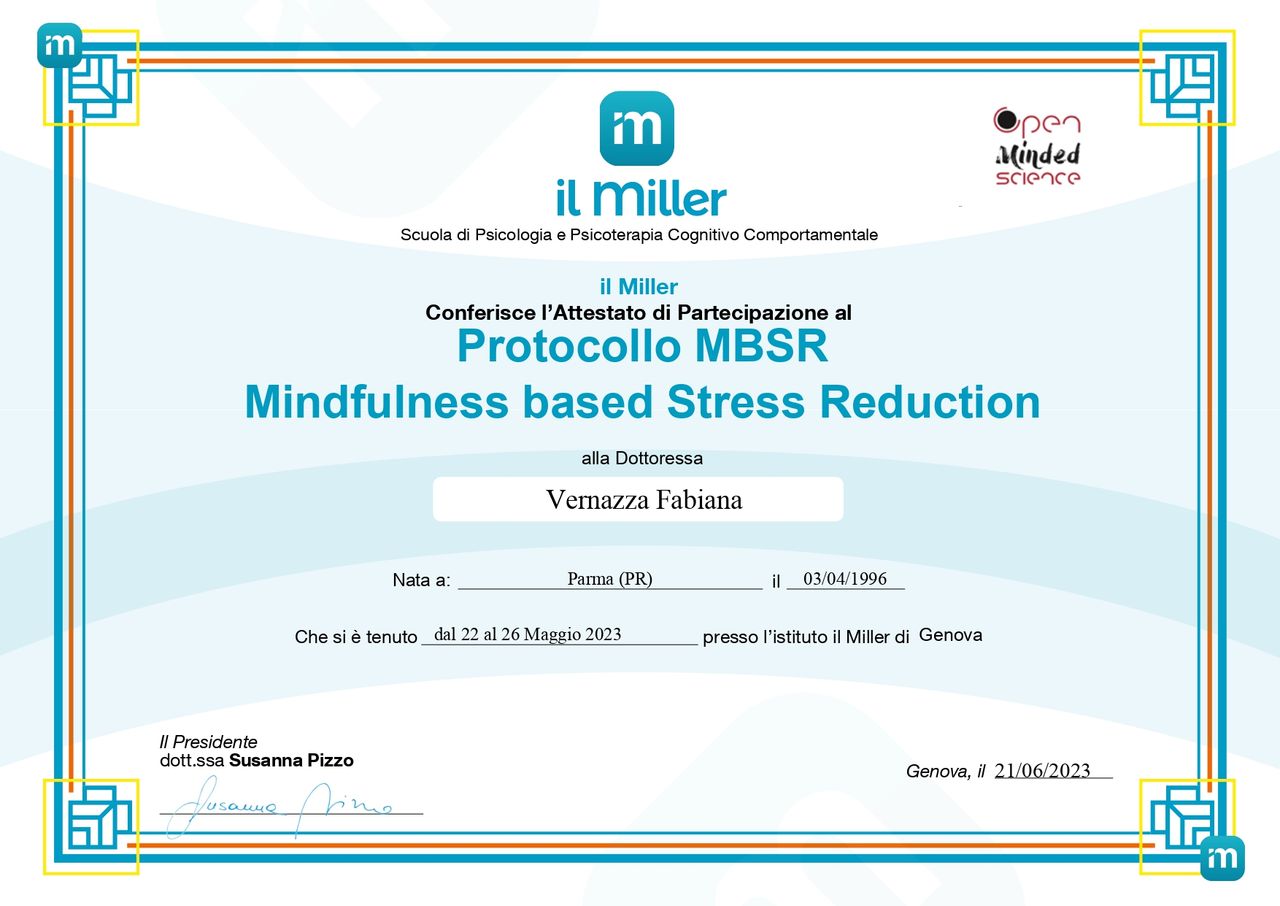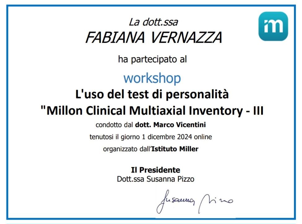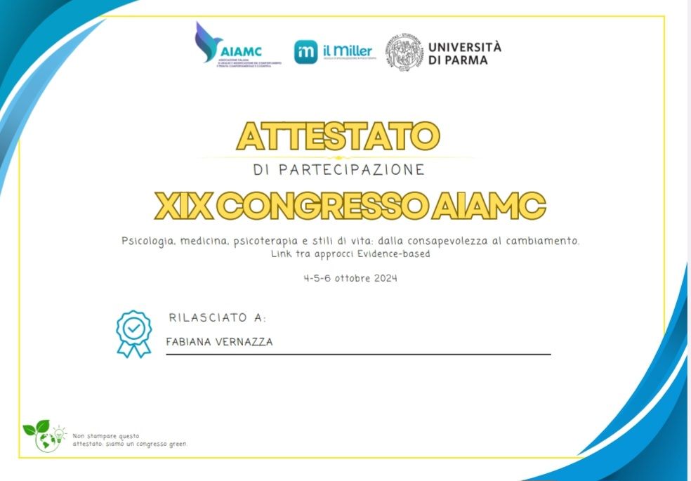 Mi chiamo Fabiana e sono una psicologa clinica ad orientamento cognitivo-comportamentale. Sono socia dell’Associazione Italiana di Analisi e Modificazione del Comportamento e Terapia Comportamentale e Cognitiva (AIAMC), che promuove l’utilizzo di tecniche basate sull’evidenza per il benessere psicologico.