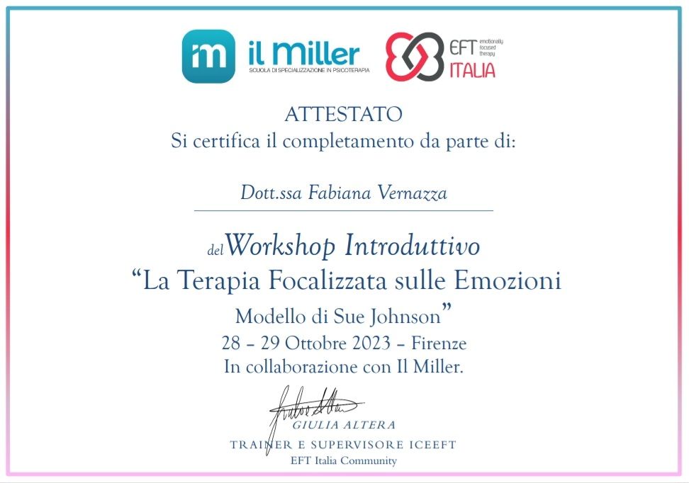 Ho fatto il primo colloquio con la Dottoressa Vernazza ieri e mi sono trovata molto bene. Ero molto agitata ma lei è riuscita a tranquillizzarmi e mi sono sentita libera di parlare del mio problema. Mi ha spiegato come si svolgerà il percorso e ho deciso di continuare con lei.
