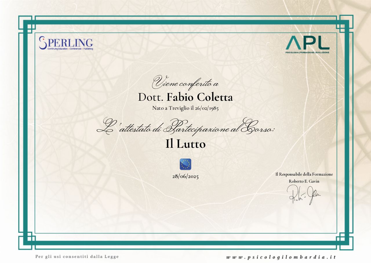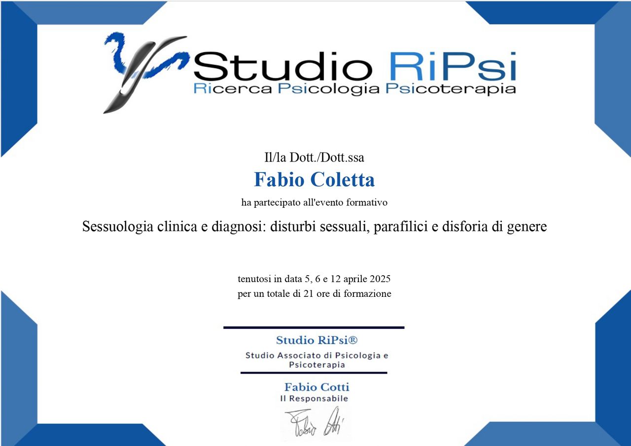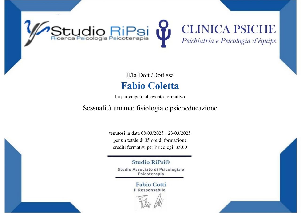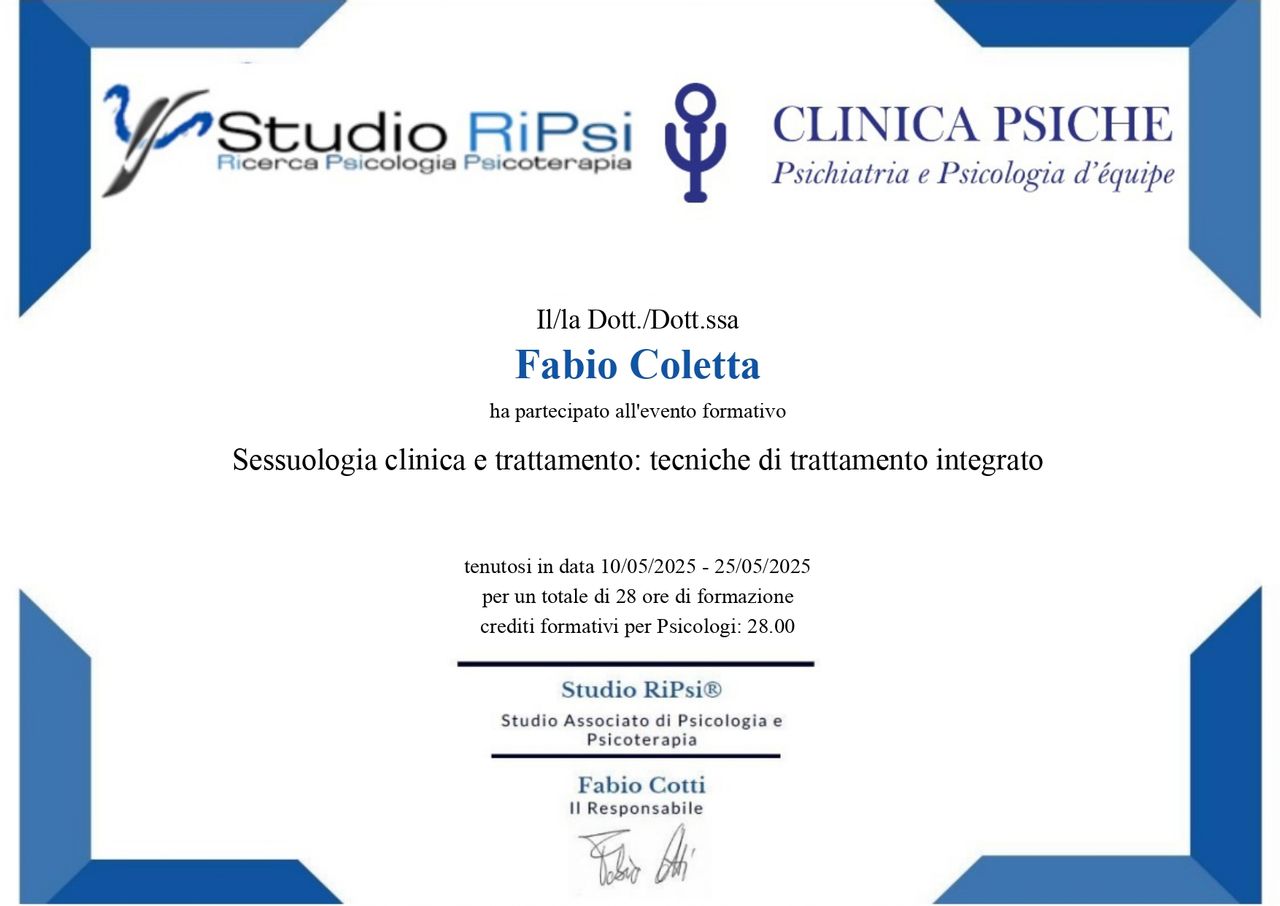 Sono Fabio Coletta, psicologo e sessuologo iscritto all'Ordine degli Psicologi della Lombardia, ed esercito a Treviglio in Via dei Mille n°22, a Bergamo in via Sant'Elisabetta n°3 ed online. Mi occupo di promozione del benessere psicologico, offrendo percorsi di sostegno e consulenza rivolti a individui, coppie e gruppi. La mia pratica si basa su un approccio integrato per accompagnare le persone nel superamento di momenti di difficoltà e nella valorizzazione delle proprie risorse personali.