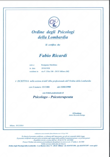 Sono stato paziente del dott. Ricardi la prima volta all' età di ventiquattro anni. Scettico per natura ho iniziato con poca fiducia a causa dei miei pregiudizi sulla psicoterapia. Il dott. Ricardi mi ha fatto svolgere alcune sedute individuali, e dopo un certo periodo ho iniziato la terapia di gruppo. Questo primo periodo è durato un paio di anni, e si è rivelato per me fondamentale. Sono tornato in terapia altre due volte a distanza di anni, ma per brevi periodi, e sempre con sedute individuali. Ho partecipato inoltre due volte a seminari di terapia della durata di un weekend ciascuno. Nel mio percorso ho potuto apprezzare la grande professionalità e competenza, la certezza del rispetto del segreto professionale, la cura e la dedizione del dott.Ricardi, alla fine divenuto un punto di riferimento per la mia vita, sempre e comunque all'interno del rapporto paziente -terapeuta: ora alla soglia dei cinquanta anni considero questa esperienza come un mio patrimonio personale