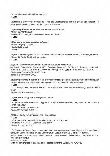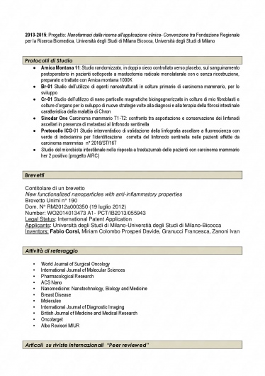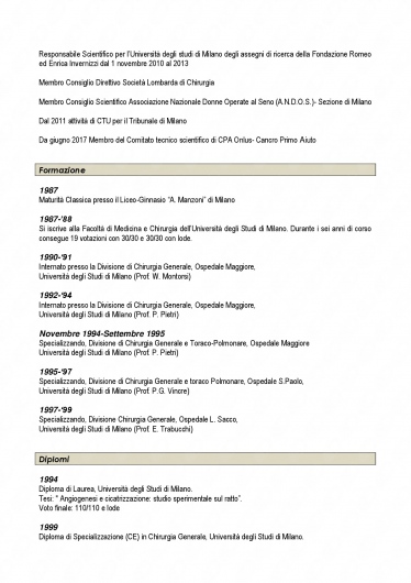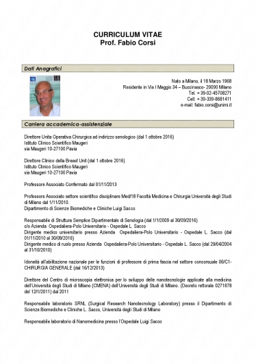 Il Dott. Fabio Corsi si è laureato in Medicina e Chirurgia presso l’Università degli Studi di Milano nel 1994 e ha conseguito la specializzazione in Chirurgia Generale nel 1999, sempre presso il medesimo ateneo. Dal 1994 è iscritto all’Albo Provinciale dei Medici Chirurghi di Milano. Attualmente lavora come Direttore dell’Unità Operativa Chirurgica ad indirizzo senologico presso gli Istituti Clinici Scientifici Maugeri IRCCS di Pavia ed è Responsabile del Laboratorio di Nanomedicina e Imaging Molecolare presso l’Ospedale Luigi Sacco di Milano.