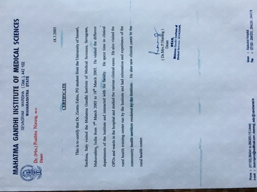 Nel marzo 2005 frequenta il reparto di Ortopedia e traumatologia afferente al Mahatma Gandhi Institute of Medical Sciences, Sevagram - India -, in accordo col programma di collaborazione con i paesi in via di sviluppo dell’ Ateneo Sassarese.