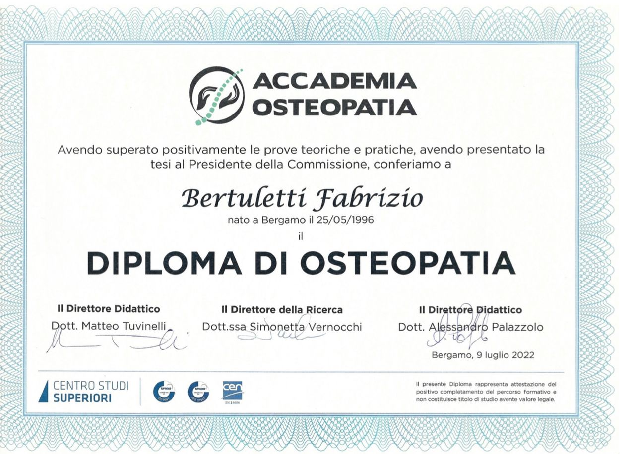 Mi chiamo Fabrizio Bertuletti e sono un osteopata e massoterapista. Nel mio lavoro mi occupo principalmente della valutazione e del trattamento delle problematiche muscolo-scheletriche e funzionali, accompagnando ogni paziente in un percorso personalizzato e costruito sulle sue reali esigenze.