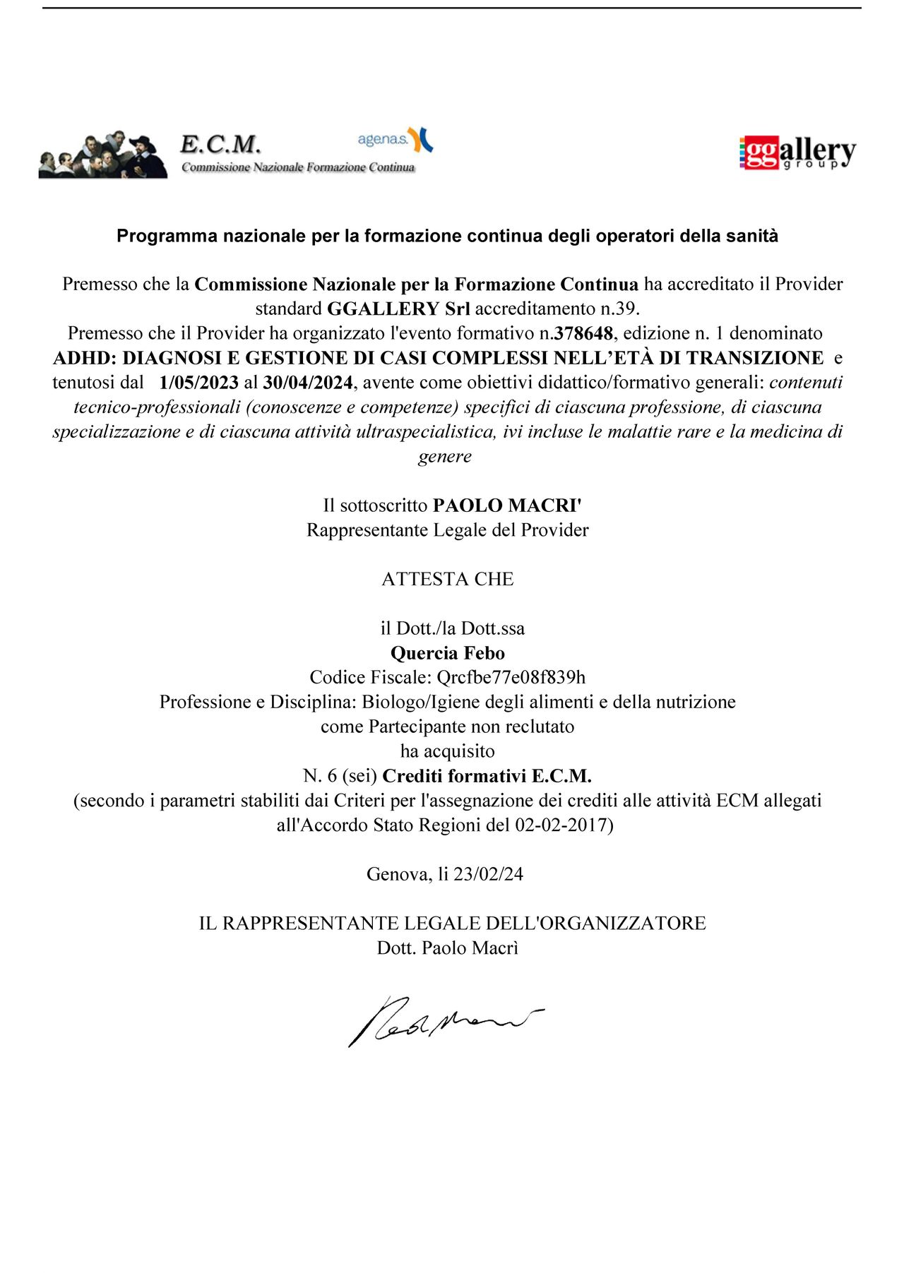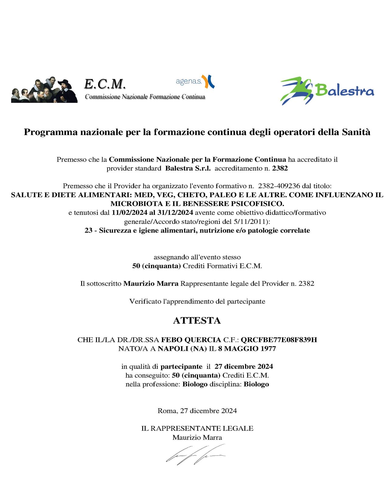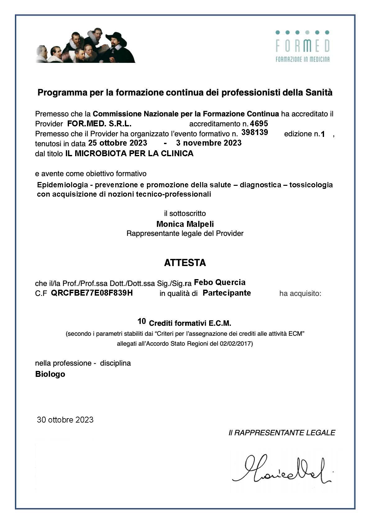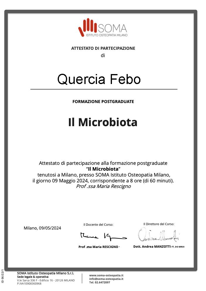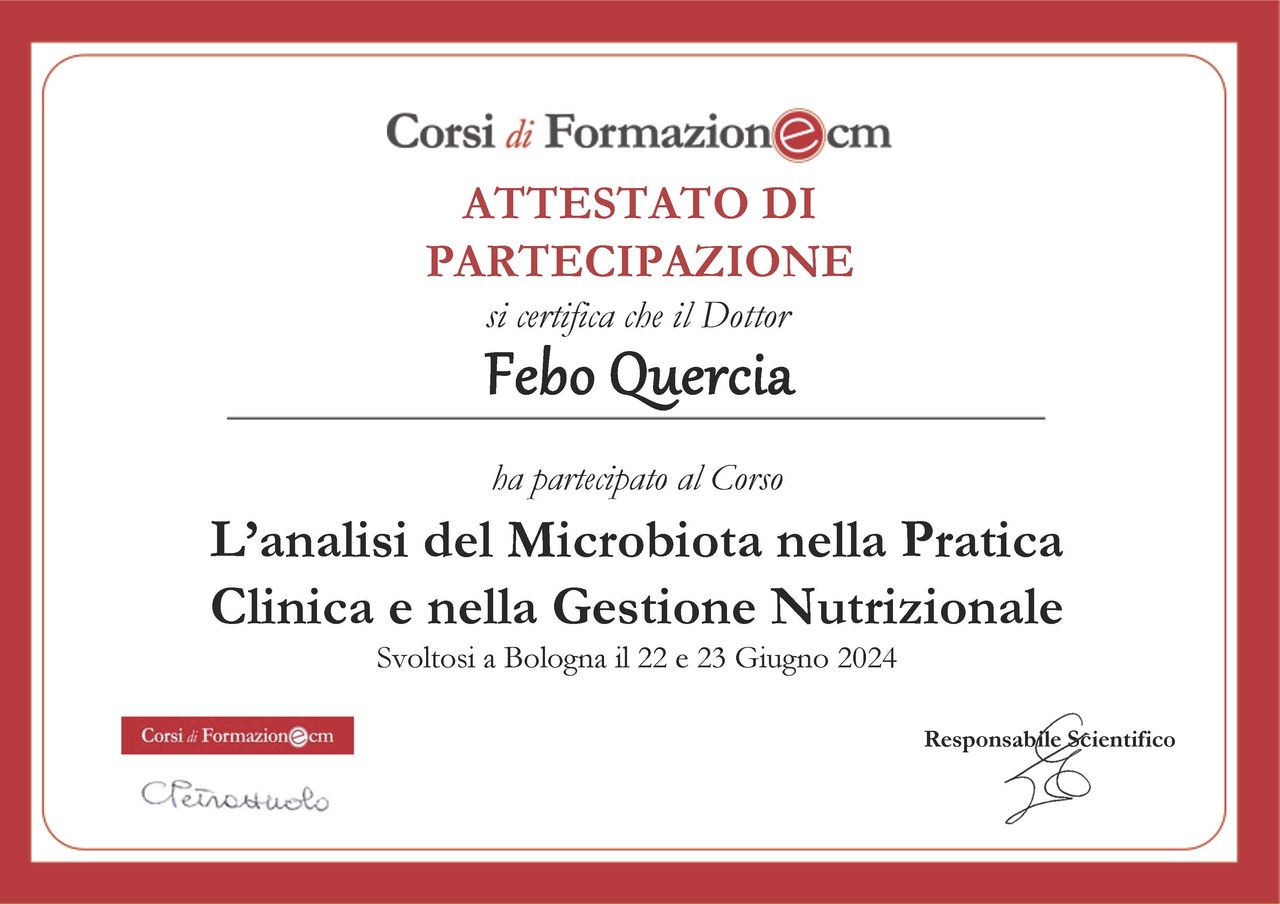 Il dottor Febo Quercia mi segue dal 2016. Mi e' stato diomto aiuto specialmente per I matrimoni dei miei due figlia, Francesca 2017 Davide 2024. Ho perso 10 kili per il matrimonio di Francesca e ben 15 per il matrimonio di Davide. Ora sonó di nuovo in cura perché sonó aumentará ma solo 4 kili e oggi me ho perso 2! Quindi il Dottor Febo Quercia e' un nutrizionista molto valido.