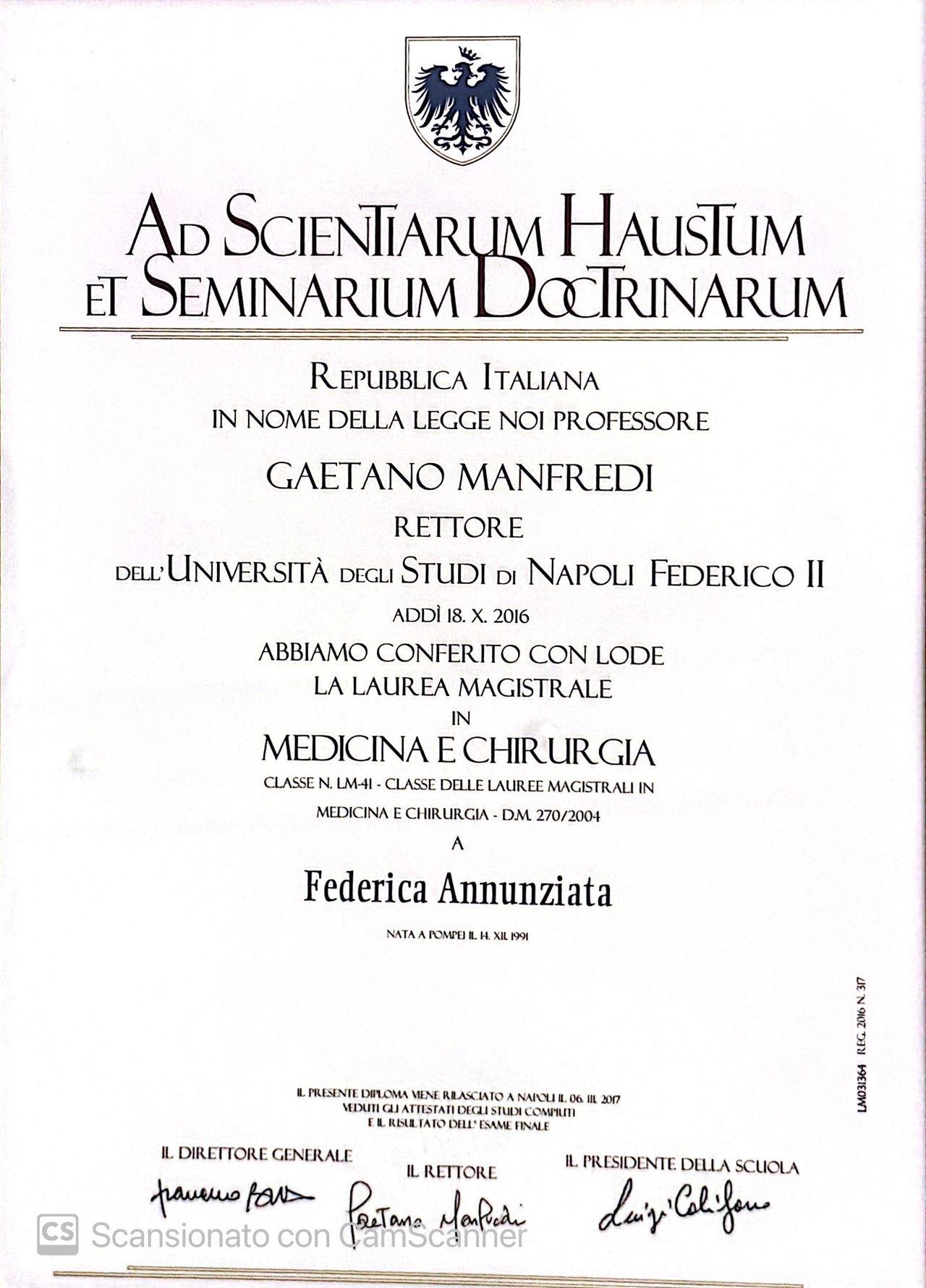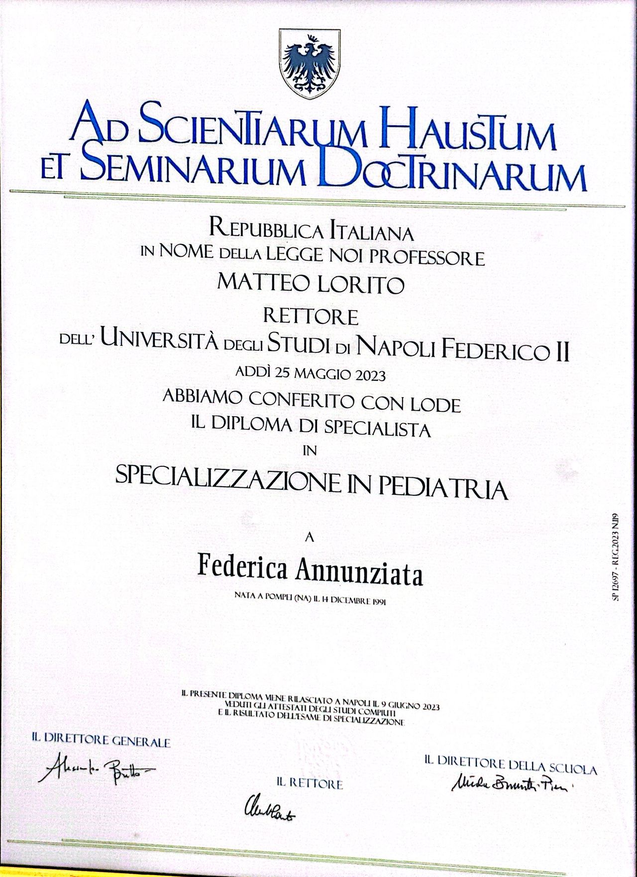 Nel 2016 ho conseguito con il massimo dei voti la laurea in Medicina e Chirurgia presso l’Università degli Studi di Napoli Federico II presentando una tesi di interesse pediatrico. Dopo la laurea ho deciso di continuare a perseguire questa strada, scegliendo di specializzarmi in pediatria presso la scuola della stessa università.
