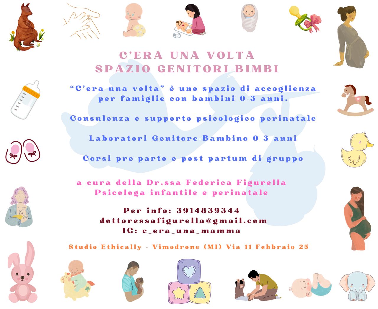 Ciao a tutti! Sono Federica, psicologa infantile e perinatale. Il parto e la gestazione sono momenti delicati nella vita, per questo dedico molta attenzione ai corsi di accompagnamento alla nascita e supporto al postpartum. Con una equipe di professionisti sarete seguiti in un percorso di accompagnamento alla genitorialità prima e dopo il parto, in un ambiente familiare e privo di giudizio, ove le vostre risorse saranno messe al primo posto. Siete invitati anche ad iscrivervi ai laboratori genitori-bambini dagli 0 ai 3 anni. Speso questa fascia di età viene considerata poco, poiché ritenuti ancora troppo piccoli. In realtà, si può fare tanto insieme ai vostri bambini, parola di ex educatrice di asilo nido. Le attività di gruppo si attiveranno con almeno 2 iscritti. Per informazioni chiamare il numero 3914839344