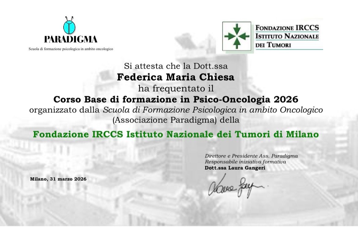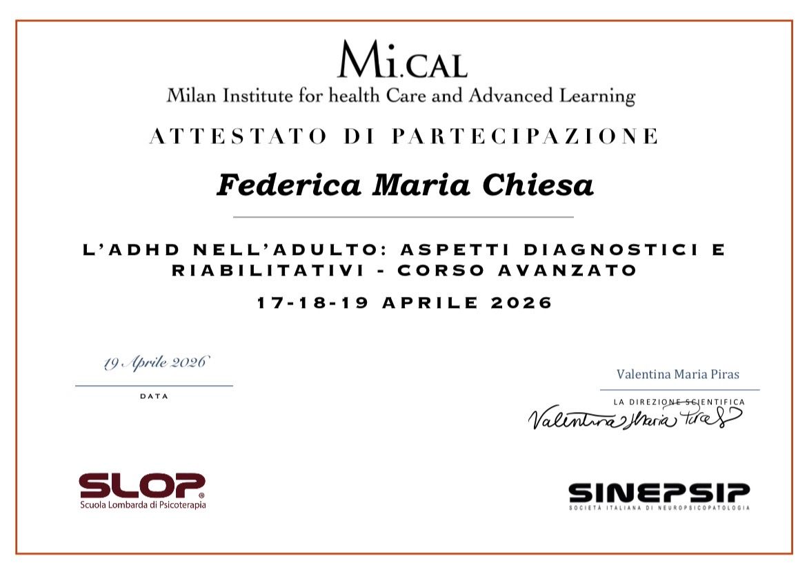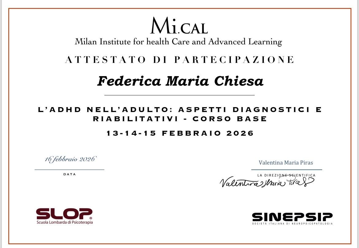 Ho svolto corsi di formazione in psiconcologia e ADHD nell’adulto.