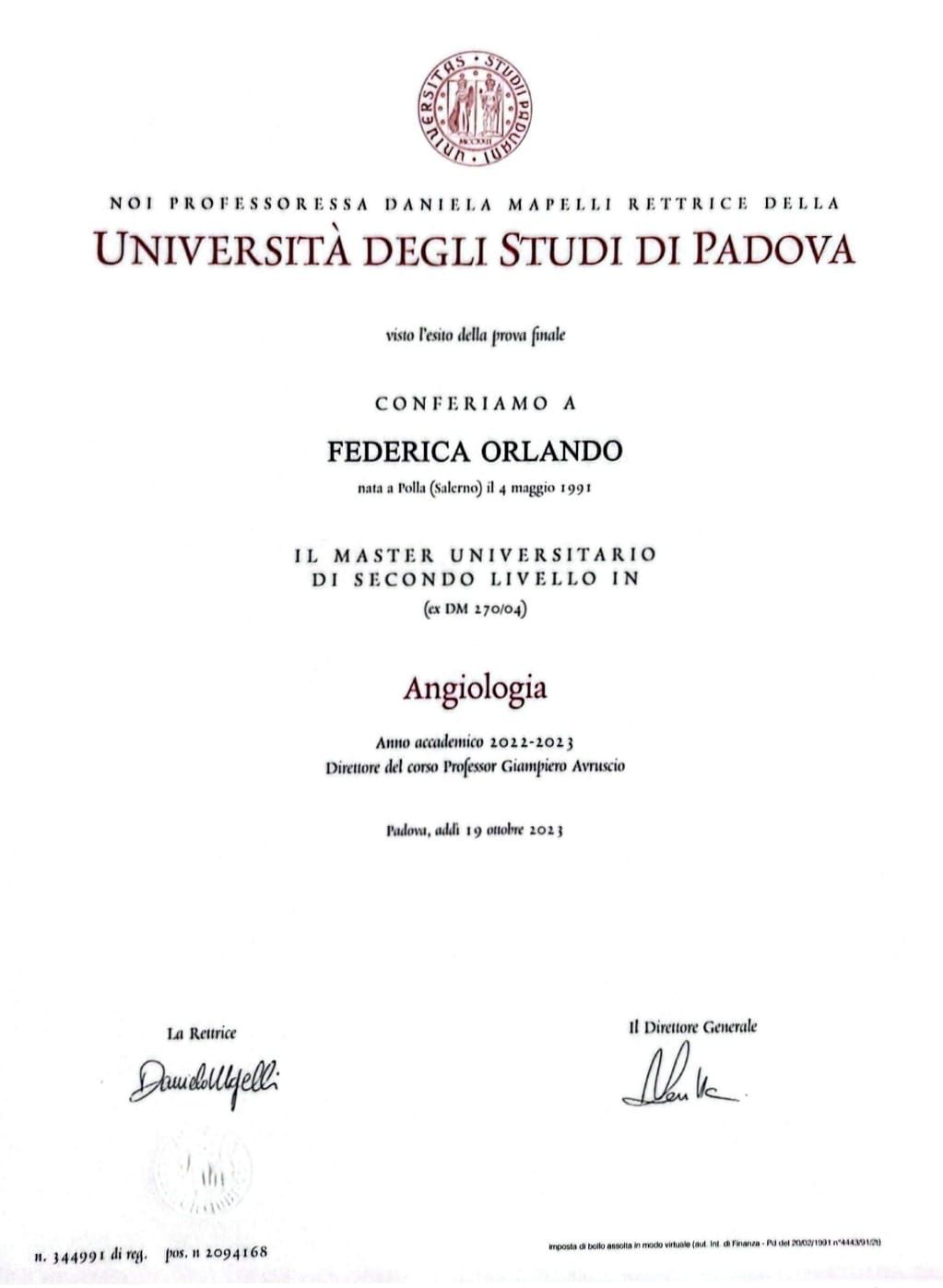 Sono attualmente membro dell'Associazione Flebologica Italiana (AFI) e della Società Italiana per lo studio dell'emostasi e della trombosi (SISET).
