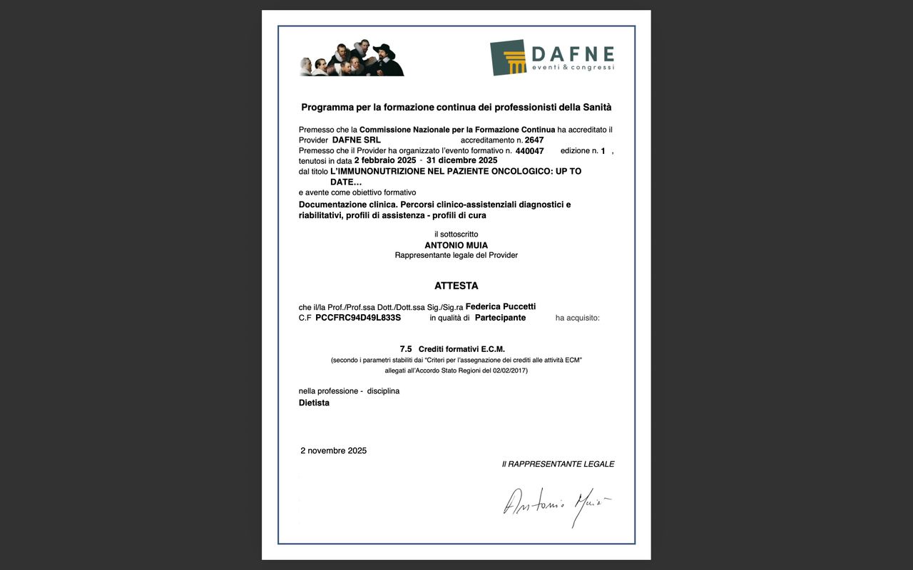 Il suo riscontro conferma la solidità del piano nutrizionale implementato e l’allineamento rispetto agli obiettivi concordati. Apprezzo molto la sua raccomandazione e resto pienamente a disposizione per supportarla nelle successive fasi di ottimizzazione del percorso.