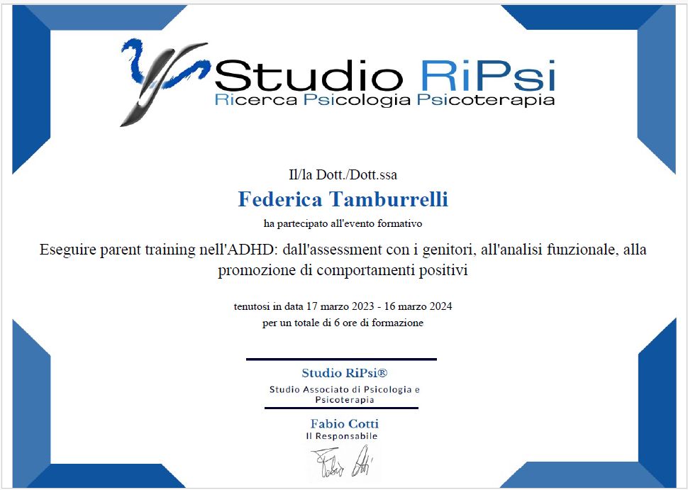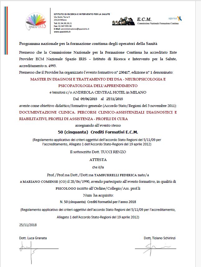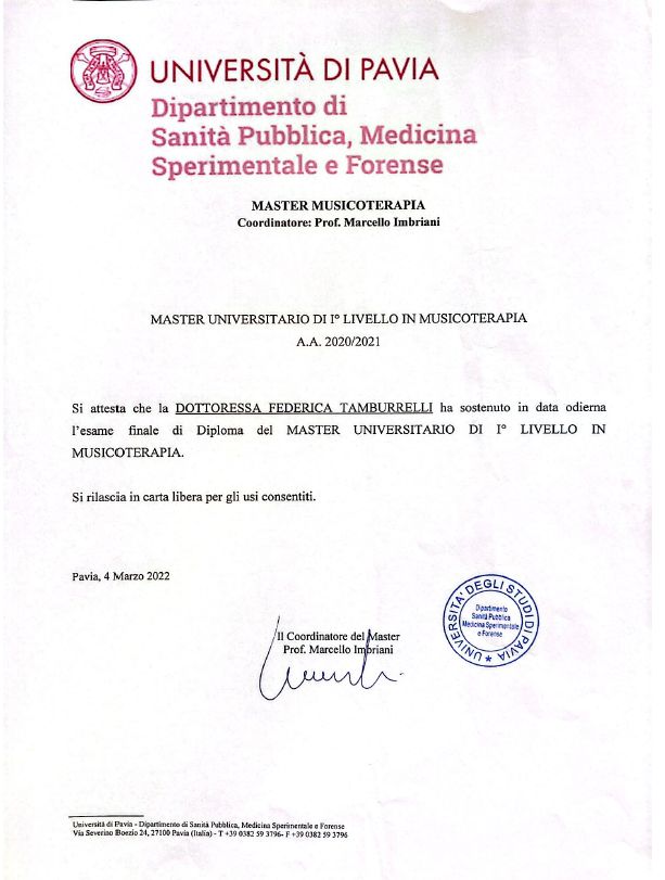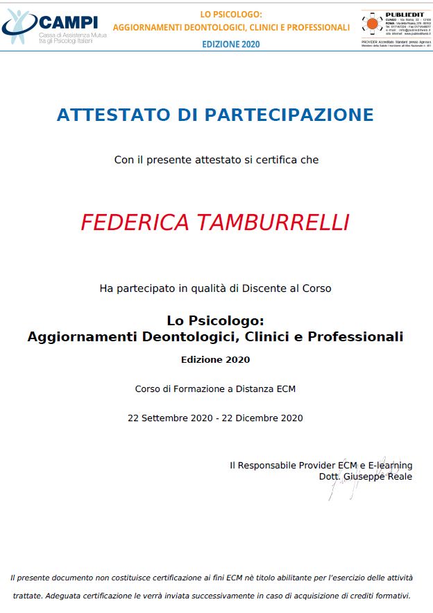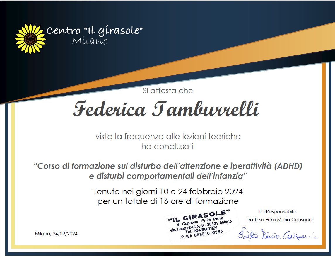 Sono la Dottoressa Federica Tamburrelli, psicologa iscritta all'Ordine degli psicologi della Lombardia. Sono inoltre una musicoterapeuta. Mi sono laureata presso la facoltà di Psicologia clinica, dello Sviluppo e Neuropsicologia dell'Università degli studi di Milano - Bicocca. Ho seguito poi alcuni corsi di formazione su svariate tematiche, tra cui: tutoraggio per bambini e ragazzi con difficoltà o disturbi di apprendimento, ADHD, Game Trainer (utilizzo del gioco per potenziare le funzioni esecutive), plusdotazione intellettiva. Ho svolto il master sui Disturbi Specifici di Apprendimento (DSA), grazie a cui ho potuto costituire un'equipe che svolge attività di prima certificazione diagnostica e di cui sono referente. Ho conseguito poi la qualifica di musicoterapeuta con un master annuale presso l'Università degli studi di Pavia. Esercito la mia professione a Saronno (VA), Cesate (MI) e online, occupandomi di: - Sostegno psicologico rivolto a tutte le fasce d'età (ad esempio per difficoltà emotive, ansia, stress, ...) - Disturbi Specifici di Apprendimento (valutazione, trattamento e tutoraggio) - Potenziamento cognitivo - Gruppi per bambini e ragazzi con ADHD - Parent training - Sostegno alla genitorialità - Musicoterapia per singoli e gruppi di donne in gravidanza