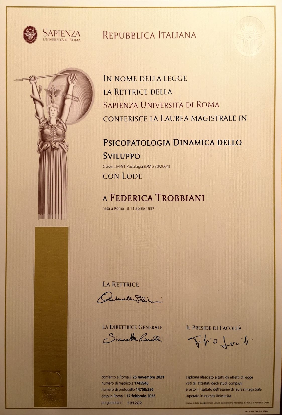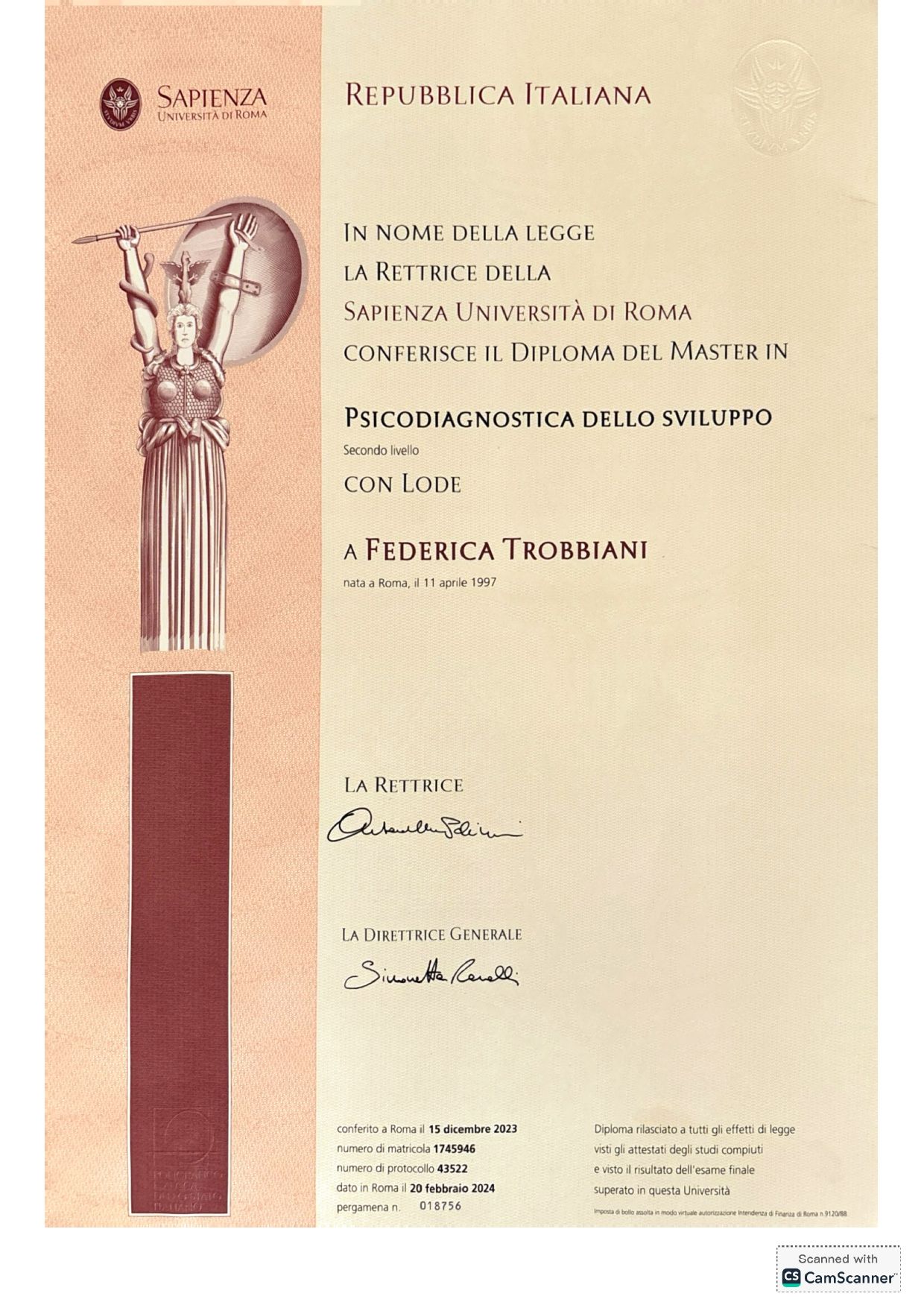 "C'è una storia dietro ogni persona. C'è una ragione per cui siamo quello che siamo." - S. Freud Sono Federica, da sempre un'appassionata di storie, lette o ascoltate, e dal 2023 sono anche una psicologa. Il mio lavoro mi permette di entrare in contatto con le storie uniche delle persone che scelgono di condividere con me gioie, dolori, successi e fallimenti vissuti nel corso della loro vita. Sono una psicoterapeuta in formazione presso la Scuola di Specializzazione in Psicologia Clinica dell'Università Sapienza di Roma. Nello stesso Ateneo ho conseguito un Master in Psicodiagnostica dello Sviluppo e un Corso di Alta Formazione in Disturbi del Comportamento Alimentare nell'Età Evolutiva. Mi sono formata su un approccio psicodinamico, secondo cui, attraverso un ascolto empatico, il lavoro terapeutico permette di dare valore alle esperienze soggettive per comprendere come queste influenzano i nostri pensieri, le nostre azioni e le nostre relazioni, in una storia che è in continua evoluzione. Lavoro online e in presenza con bambini, adolescenti, adulti e giovani adulti per garantire uno spazio sicuro e non giudicante dove esprimersi, progettando insieme un percorso personalizzato per sostenere e sviluppare le potenzialità individuali al fine di migliorare la qualità della vita personale, familiare, lavorativa o di coppia, fronteggiando disagi e sofferenze.