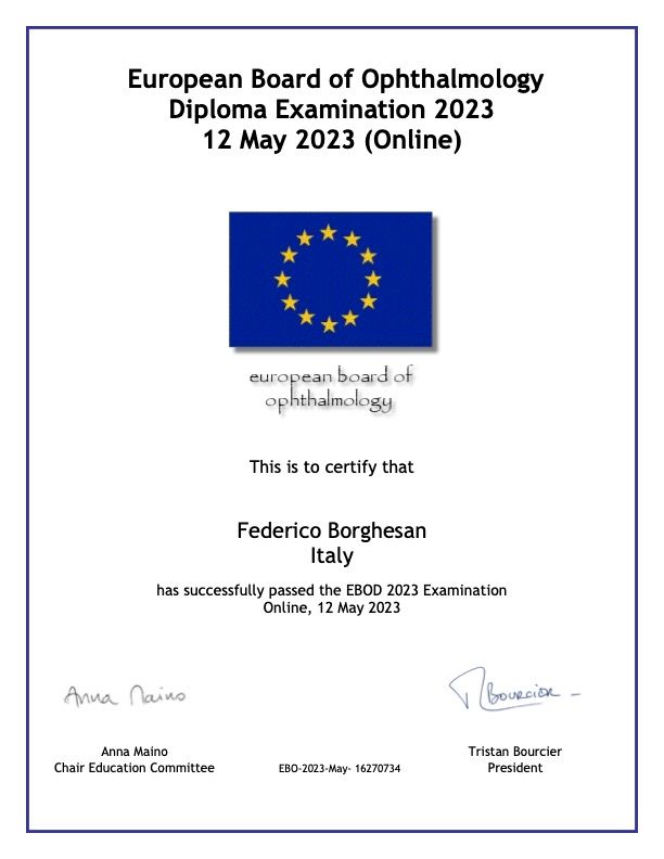 Salve, sono il dottor Federico Borghesan, medico chirurgo specialista in oftalmologia. Mi dedico con attenzione alla diagnosi e alla cura delle più comuni patologie oculari dell’adulto, con particolare focus nell'ambito della retina, accompagnando ogni persona con un percorso personalizzato e sereno. In ambito ospedaliero svolgo attività ambulatoriale, diagnostica e chirurgica, sempre guidato dalle evidenze scientifiche più aggiornate. Credo molto nell’ascolto, nel dialogo chiaro e nel creare un clima di fiducia, perché prendersi cura della vista significa prima di tutto prendersi cura della persona.