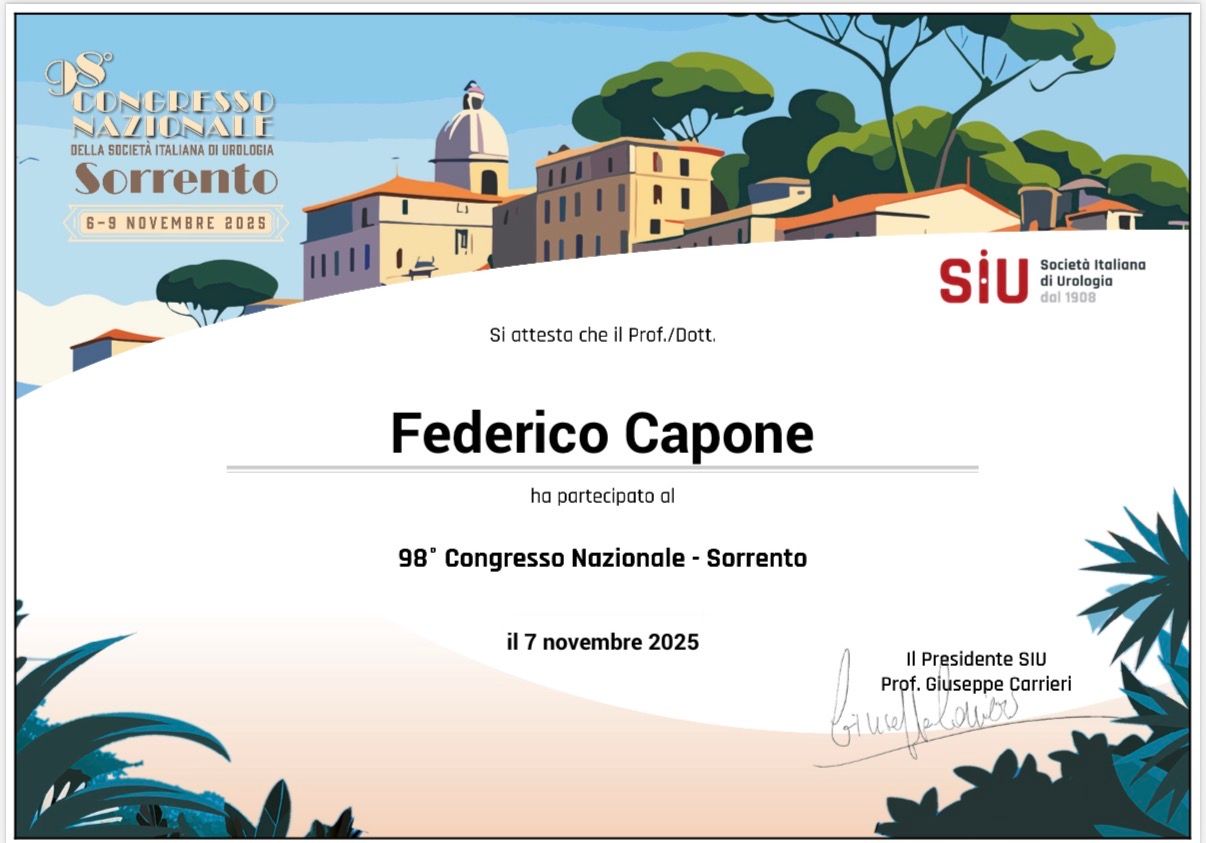 Partecipo regolarmente ai principali congressi nazionali e internazionali (SIU, EAU), per offrire ai miei pazienti trattamenti sempre aggiornati e basati sulle più recenti evidenze scientifiche.