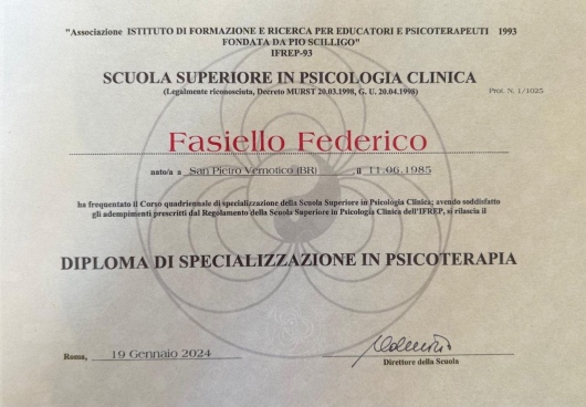 Ho iniziato da un po di mesi il mio percorso con il Dott. Fasiello, che è riuscito sin da subito ad aiutarmi facendomi sentire compreso e non giudicato. Professionale, empatico e gentile, anche molto preparato e chiaro nelle spiegazioni. Non sarei riuscito a superare gli ostacoli che vedevo nel mio percorso senza il suo aiuto e di questo gli sarò per sempre molto grato.