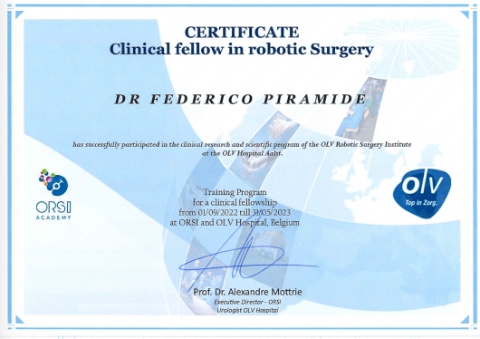 ll Dott. Federico Piramide lavora come Dirigente medico Urologo presso presso la Divisione Universitaria di Urologia, diretta dal Prof. Cristian Fiori, dell'Azienda Ospedaliero-Universitaria San Luigi Gonzaga di Orbassano (Torino). Si è laureato in Medicina e Chirurgia e ha ottenuto la specializzazione in Urologia presso l'Università degli Studi di Torino con il massimo dei voti e lode. Durante il percorso di specializzazione ha svolto una fellowship clinico-scientifica presso il reparto di Urologia, diretto dal Prof. Alex Mottrie, del OLV Hospital (Aalst-Belgio). Qui ha perfezionato le sue conoscenze in campo di chirurgia robotica ed in particolare ha partecipato ad attività di sala operatoria con diverse piattaforme robotiche (Da Vinci, Intuitive; HugoRAS, Medtronic) eseguendo da primo o secondo operatore interventi di chirurgia maggiore pelvica (prostatectomia radicale, adenomectomia prostatica, cistectomia radicale, colposacropessi) e renale (nefrectomia parziale, nefrectomia radicale, nefroureterectomia e pieloplastica). Ha iniziato l’attività scientifica nel 2016 e si è dedicato a diversi filoni di ricerca urologica: dall’uro-oncologia alla chirurgia funzionale, dall’andrologia all’urolitiasi. E’ stato autore o co-autore di oltre 400 lavori scientifici pubblicati in esteso su riviste di settore e abstract presentati a congressi nazionali ed internazionali. Possiede un'ottima conoscenza delle applicazioni della chirurgia mini-invasiva laparoscopica e robotica in campo urologico. Profonda esperienza della risonanza multiparametrica prostatica (mp-MRI) in fase di diagnosi e stadiazione per il carcinoma della prostata. In particolare esegue routinariamente biopsie prostatiche mirate MRI/TRUS fusion nel sospetto di tumore prostatico. Buona esperienza nell'endoscopia del basso e alto tratto urinario per il trattamento dell'ipertrofia prostatica benigna, dei tumori vescicali, della calcolosi vescicale, ureterale e renale. Ottima conoscenza delle più comuni problematiche andrologiche e dei percorsi riabilitativi andrologici dopo chirurgia prostatica. Ha buona conoscenza delle disfunzioni del pavimento pelvico (incontinenza urinaria maschile e femminile, prolasso genitale).