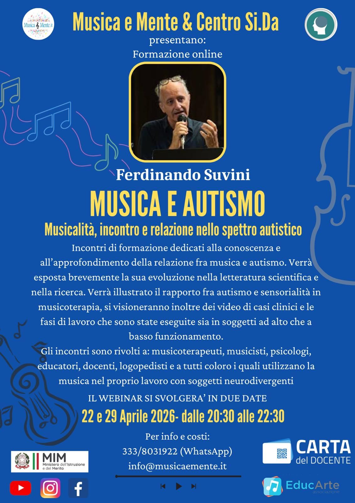 Sono nato a Milano, musicista, musicoterapeuta e psicologo con Laurea Specialistica in questi tre differenti ambiti professioniali.