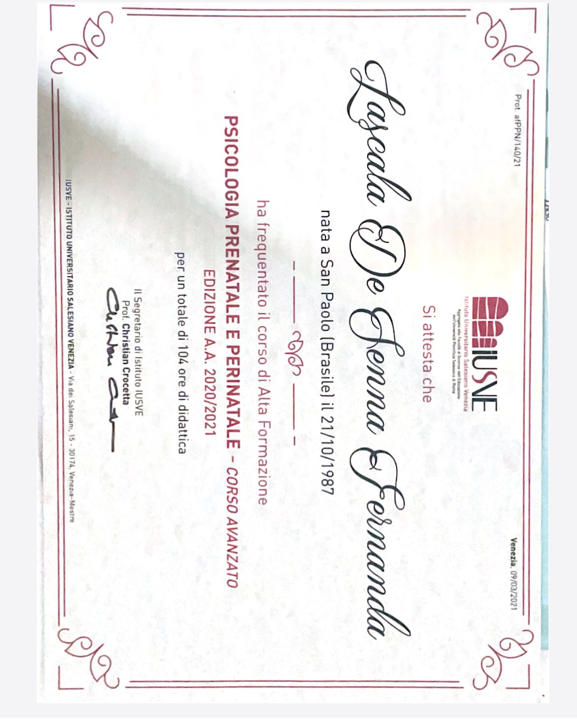 Sono arrivata dalla dottoressa Lascala de Senna circa due mesi dopo la nascita della mia bambina, in un momento in cui mi sentivo molto sola e sopraffatta. Abbiamo fatto la nostra prima consulenza online, ma nonostante la distanza mi sono sentita subito accolta e ascoltata con grande empatia. La dottoressa è molto preparata, ha una conoscenza profonda del mondo dei neonati e comprende davvero le difficoltà che si possono vivere nel post parto. Mi ha fatto sentire meno sola e più sicura come mamma. La prossima volta ci incontreremo a domicilio, e non vedo l’ora di proseguire questo percorso con lei. La consiglio con tutto il cuore a chi sta cercando un supporto competente e umano in un momento così delicato.