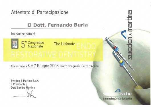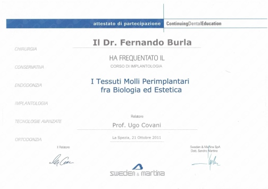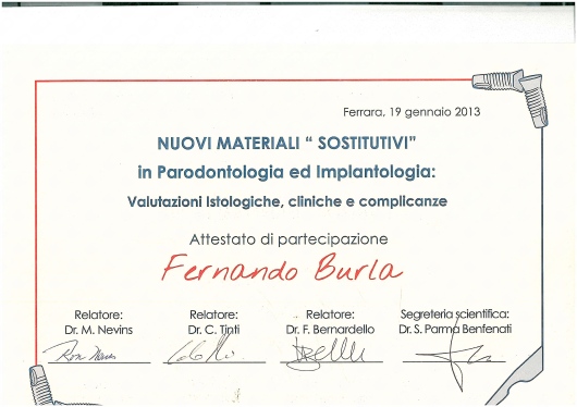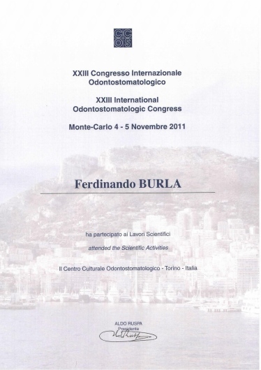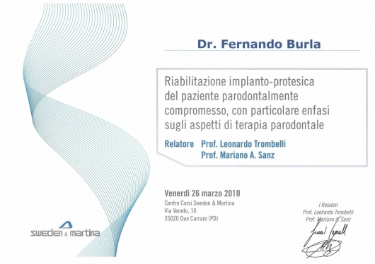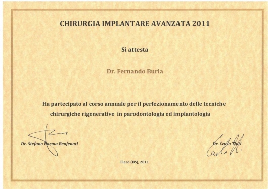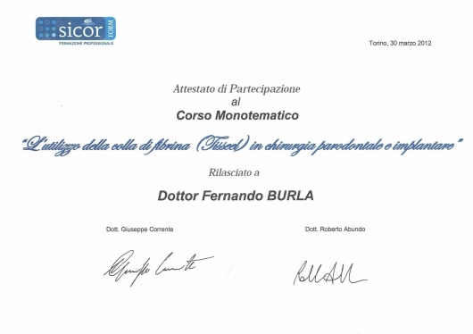 Sono Fernando Burla Medico Odontoiatra, iscritto all'albo Provinciale degli Odontoiatri di TORINO. Sono iscritto all'ANDI, socio della Italian Academy of Osseointegration, socio della Società Italiana Socket-Shield Technique, frequentatore di corsi ad alta specializzazione in campo chirurgico presso il Dr. Carlo Tinti, Prof. Stefano Parma Benfenati, Dr. Federico Tirone ed altri. Master in Medicina estetica del viso (Ospedale San Luigi di Orbassano), Corsi in Odontoiatria Conservativa diretta ed indiretta con Prof Bottachiari e in Endodonzia con il Dr. Marcoli, Certificato Invisalign. Presto la mia opera presso il mio studio privato particolarmente in campo chirurgico e protesico, per le altre discipline, compresa l'ortodonzia per adulti e bambini, sono affiancato da validissimi collaboratori di grande esperienza. Nell'esercizio del mio lavoro sono assistito da uno staff sia a livello operativo che a livello di segreteria di grandissima qualità, questo mi permette di mantenere alti standard qualitativi. Presto inoltre consulenza chirurgico-protesica presso studi esterni da almeno 15 anni e sono responsabile clinico da 12 anni di una importante struttura Medico Odontoiatrica.