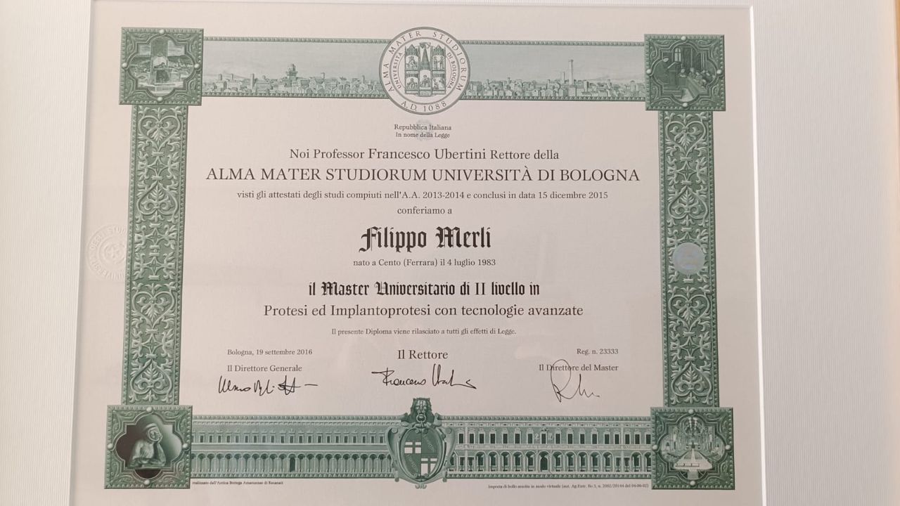 Dopo la laurea ho conseguito un master in Protesi presso l'Università di Bologna e continuo ad aggiornarmi per garantire un servizio di qualità per i miei pazienti.