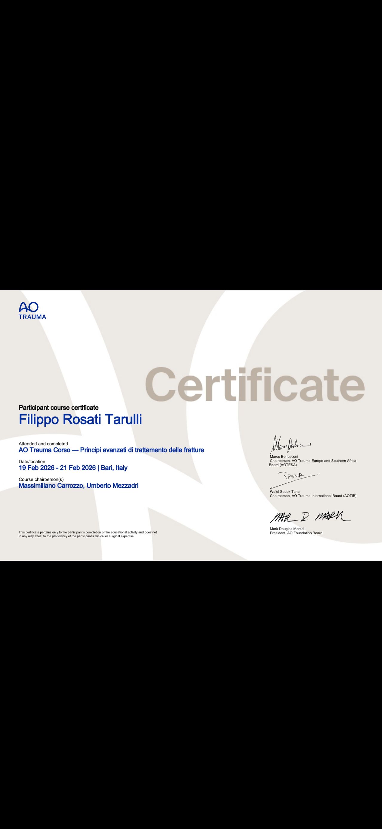 Mia moglie è stata visitata ieri dal Dottor Rosati Tarulli, ed abbiamo trovato un professionista attento ed empatico, che ascoltava tutto ciò che veniva riferito, dando poi seguito ad una visita ortopedica attenta e scrupolosa. Al termine compilava al pc (rendendo così facilmente leggibile e comprensibile anche ai non addetti ai lavori) un Referto medico molto completo, con diagnosi, prognosi e cure farmacologiche, nonchè prescriveva accertamenti specialistici (RMN e RX) per poter avere un quadro completo dell'origine della patologia dolorosa. Lo consigliamo assolutamente.