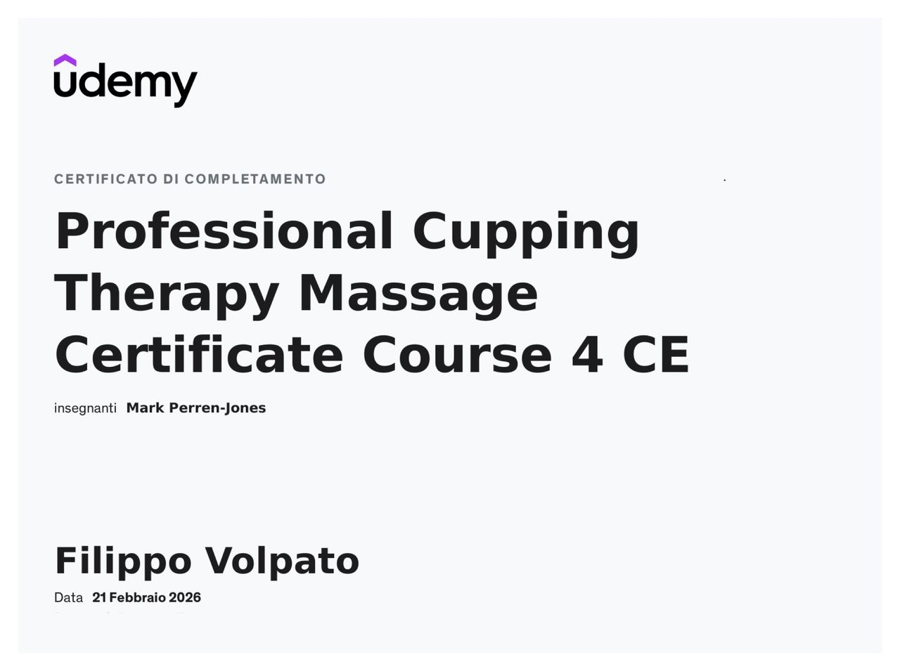 Le mie conoscenze derivano da un percorso di studio strutturato, unito a una forte passione per l’aggiornamento continuo attraverso corsi di formazione, studio personale e confronto costante con i colleghi, elementi che applico quotidianamente nella pratica clinica e nel trattamento manuale.