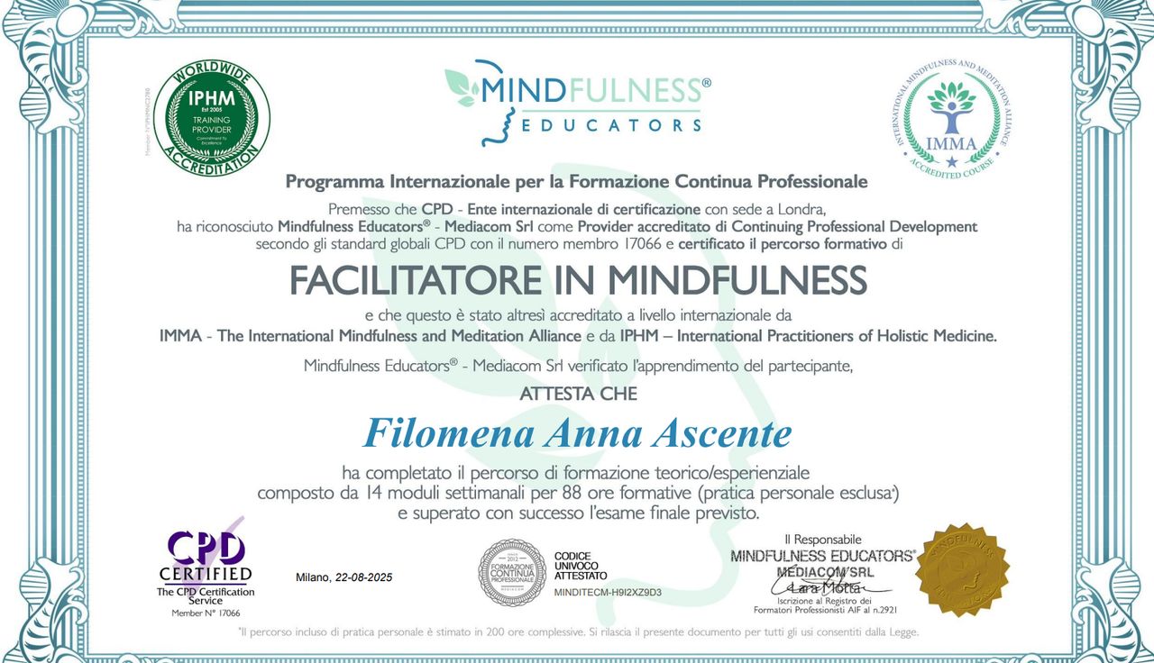 Sono Ascente Filomena Anna, psicologa esperta in Analisi Transazionale e in formazione avanzata come psicoterapeuta. Accompagno adulti e coppie in percorsi di consapevolezza e cambiamento, basandomi sul principio di okness, che valorizza la persona nella sua unicità.